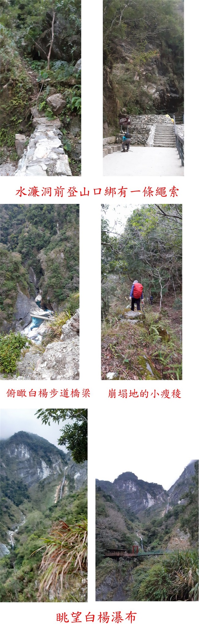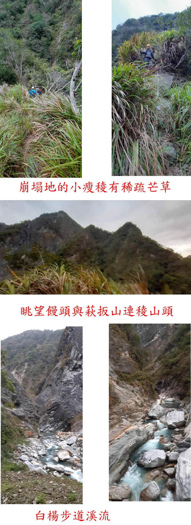 06:32上到崩塌地的小瘦稜,高605公尺,小支稜有稀疏芒草,危險處綁有繩索,俯瞰腳下步道的橋樑與白楊瀑布等,北面眺望饅頭與萩扳山連稜山頭。