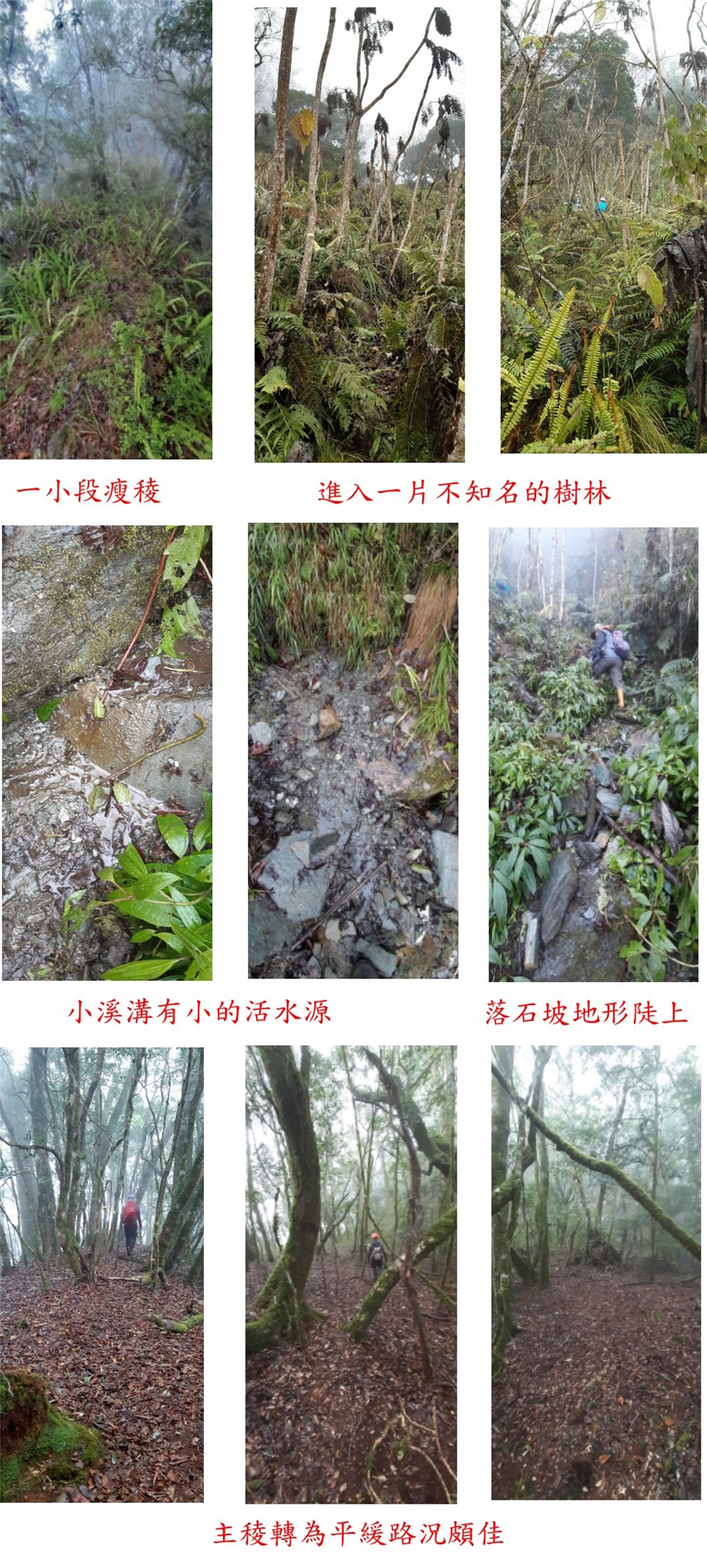 16:30下稜處,取右開始陡降,體力耗盡用滑的下山,回程找到腰繞正路一樣是垂直陡下。