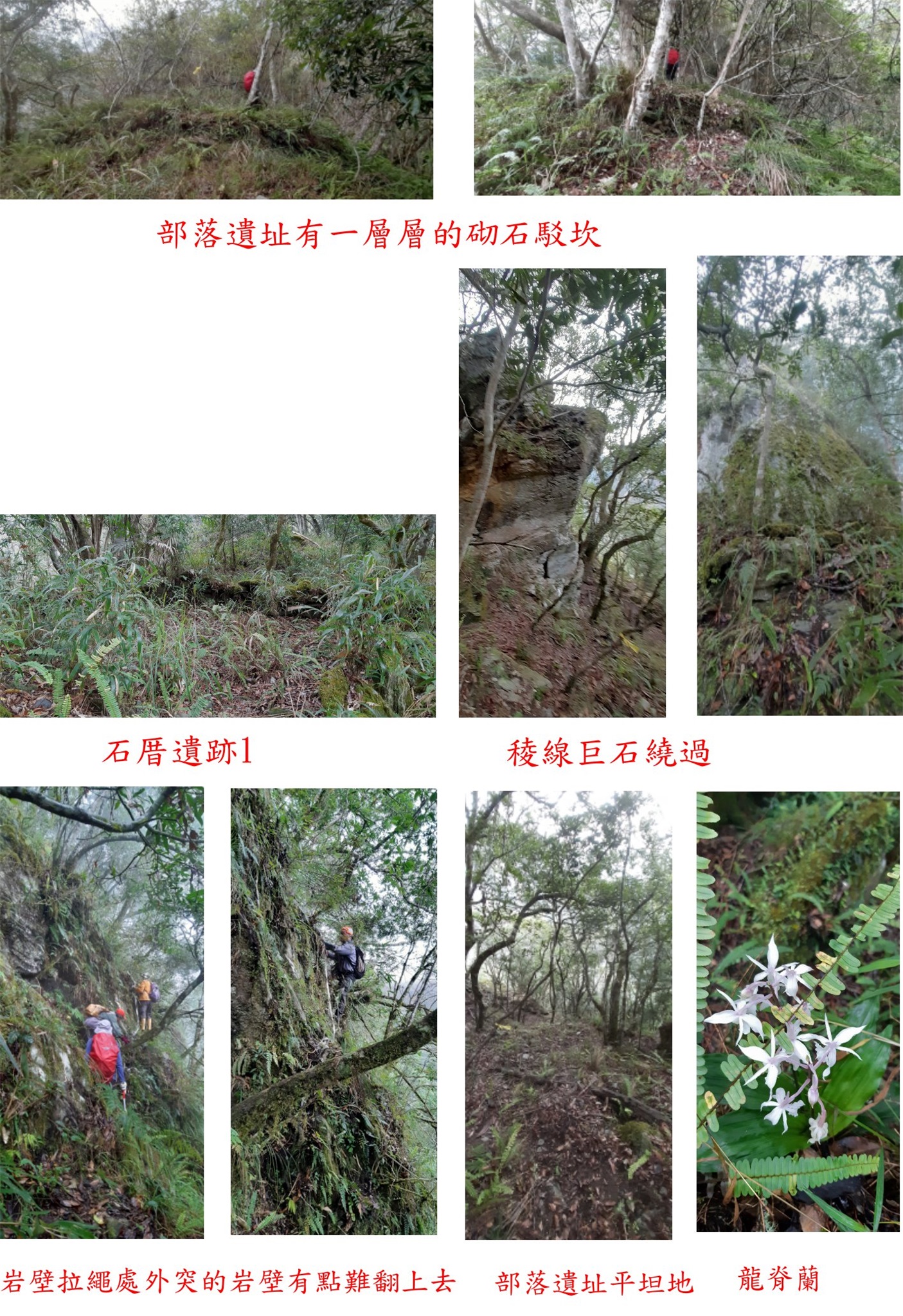 15:23石壁拉繩處,拉繩小心翼翼通過;再來還是一連串的長下坡,走到手腳無力跌了好幾跤傷痕累累;前經部落遺跡,回程經清理地座標仔細尋找還是沒看到。