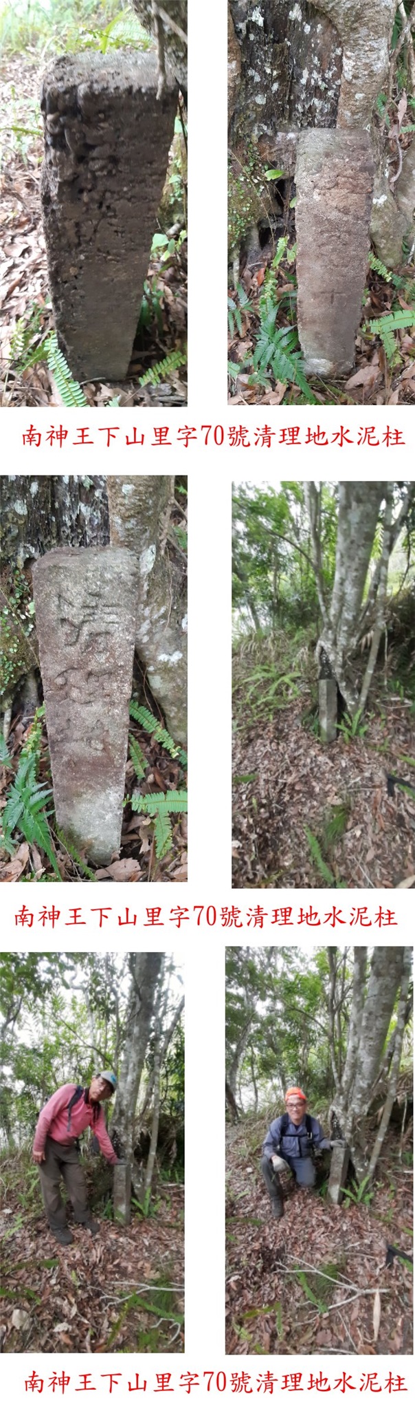 16:20△南神王下山,高834公尺,有顆里字70號清理地水泥柱,小楊兄於部落平台地下方的邊緣尋獲,業已倒地重新立在樹下,此點偏離座標70餘公尺,不知是否原來的點位錯誤?拍照後續下。