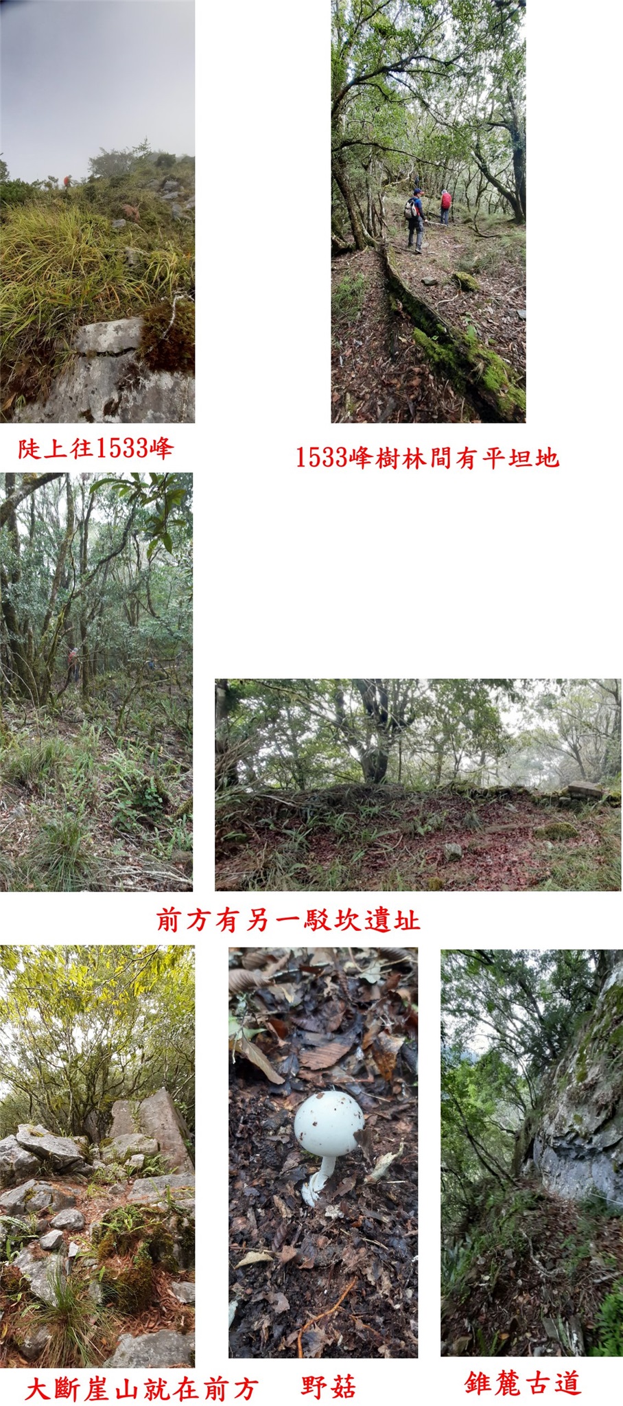 11:02抵1533峰,樹林間有平坦地,前方有另一駁坎遺址;山徑轉緩下。