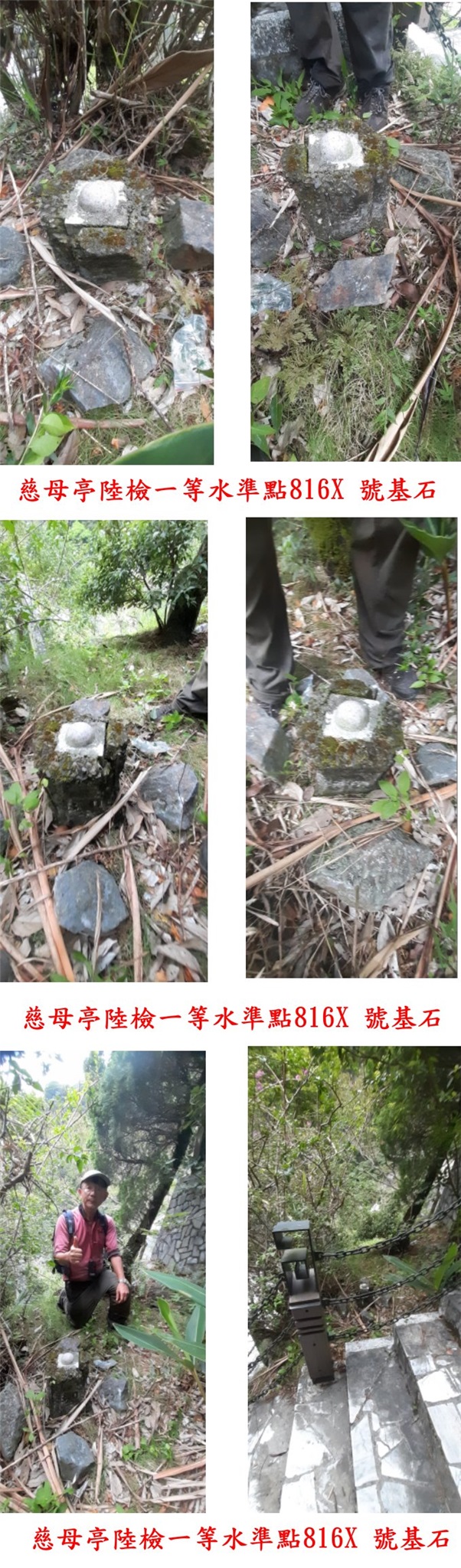 06:02△慈母亭,標高371公尺,於欄杆左側的小平台地見到慈母亭陸檢816X號水準點,基石破損嚴重號碼最後一字已看不到,此點曾來過;慈母亭的後方即錐麓古道西入口(古道10.3K),但已封閉多年。