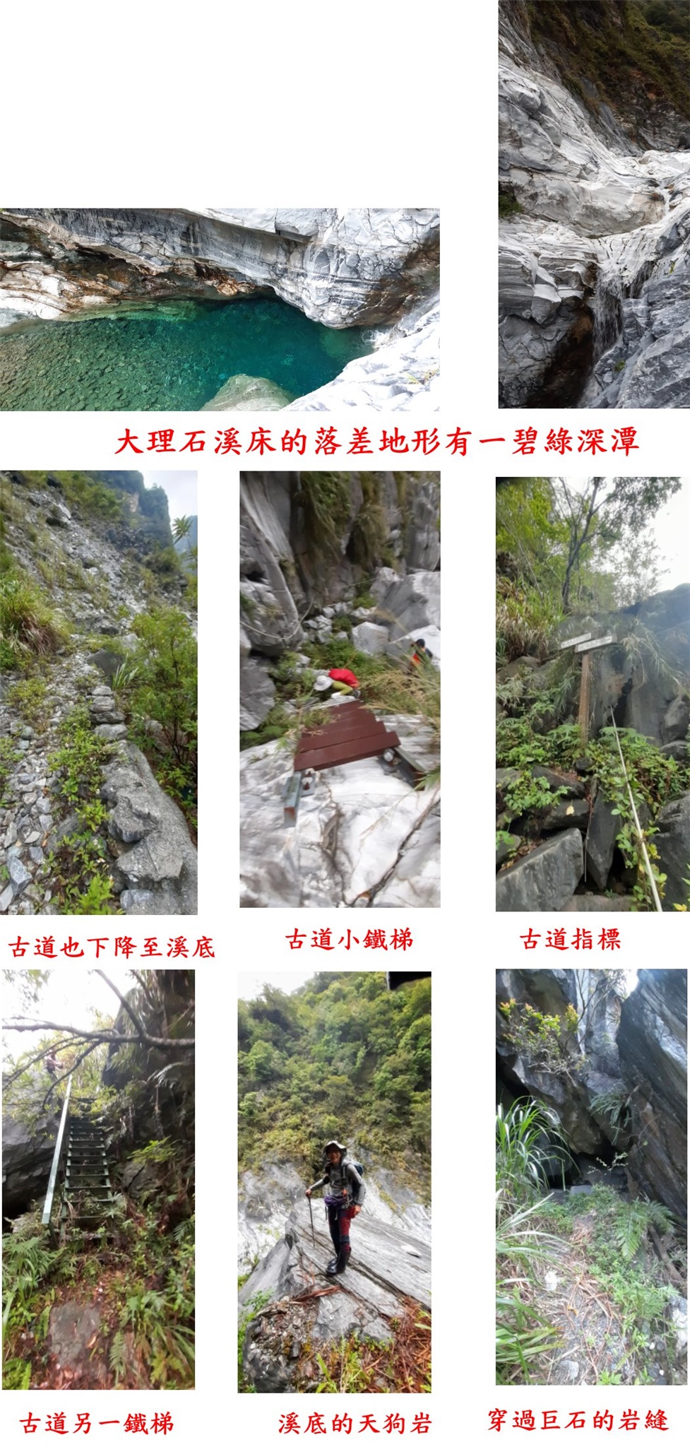 06:22溪瀑地形,溪水切割大理石形成一落差地形,下方有一碧綠的深潭,大理石的峽谷地形景色很美;古道也下降至溪底、爬小鐵梯上至巨石頂,有一古道指標,往慈母橋0.3K與往錐麓吊橋10K。