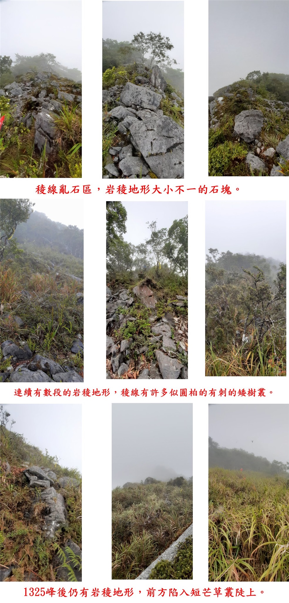10:00抵1325峰,續行仍有岩稜地形,前方陷入短芒草叢陡上,此段路況稍差。
