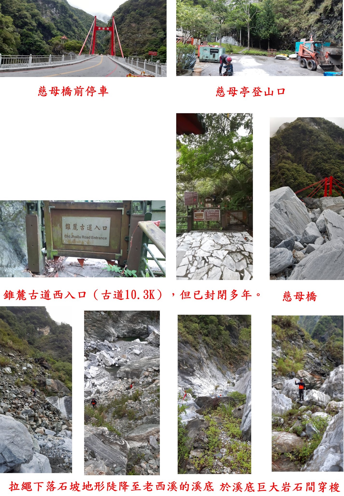 06:08拉繩下落石坡地形陡降至老西溪的溪底,左方為慈母橋,取右行於溪底巨大岩石間穿梭,跟隨路條或疊石前進,古道於山腳下的稍上方因崩塌已無法通行。