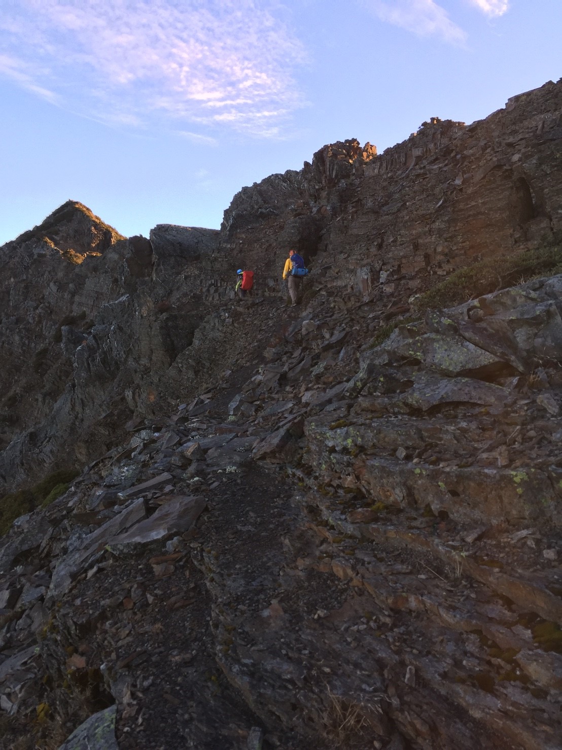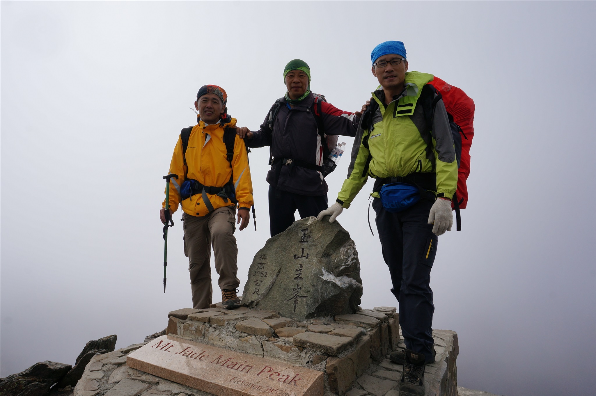 我們三人慶幸能通過稜線的考驗,在三叉路口需休息一段時間,補充食物以恢復一些體力,一開始先拉鐵鍊下切200公尺到達底鞍,一座威嚴大山矗立眼前就是東峰,繞過著名鳳尾岩,依著步道走稜線到達東峰腳下,只見一條鐵鍊從天而降,原本陰暗灰色的岩體,在陽光照射下,發出銀色亮光,看起來已經不像之前如鬼魅般的險惡,想仰望山頭位於何處,此時正旭日東昇,讓人不敢直視山頂,只能低頭、四腳並用,拉住鐵鍊穩住恐懼的心情,緩緩爬上山頂,一有閃失就GG了,山頂展望三百六十度,我們續往前進二十公尺,可看到玉山東東峰的奇特岩壁,下山真是戒慎恐懼,歲月不饒人爬回主東叉路,累喘吁吁,果然,玉山東峰為十峻之首非浪得虛名,山勢高而險峻,標高3869公尺。