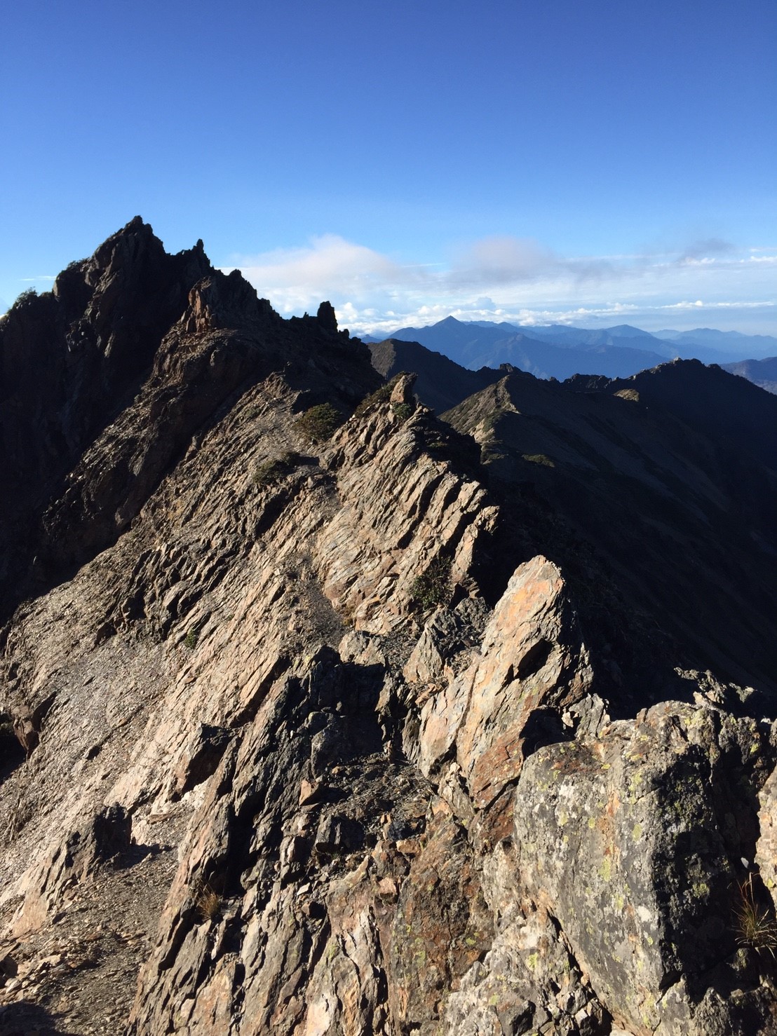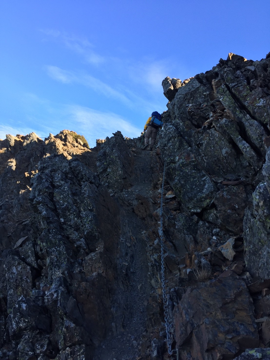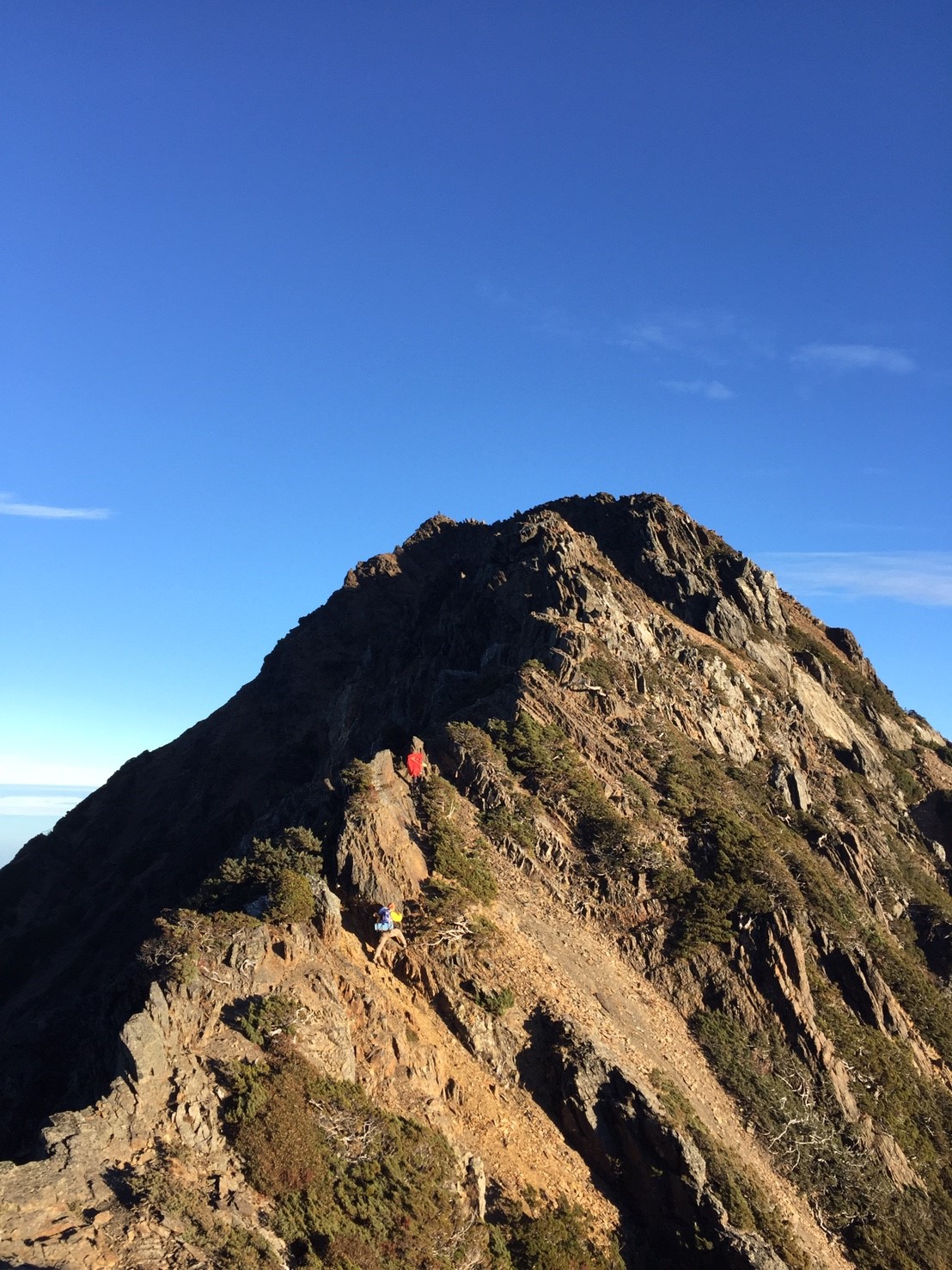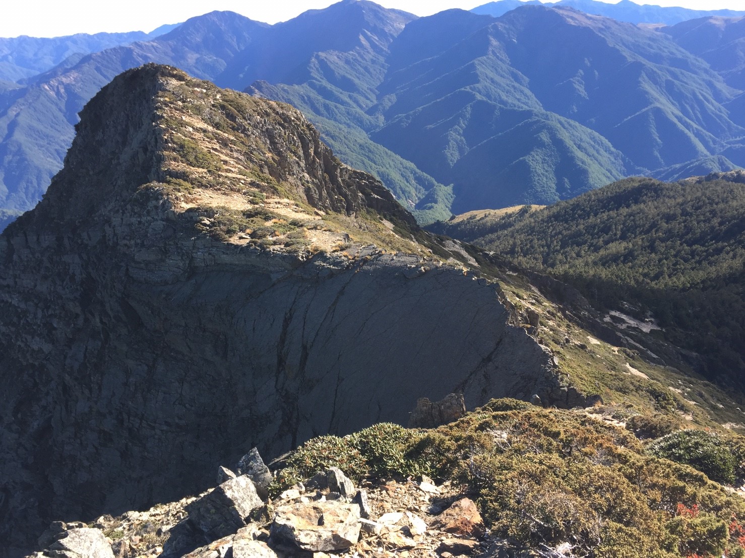 走好幾次才將玉山群峰走完,真是令人汗顏,這次從圓峰走稜線上主東叉路,稜線前面路線還算明顯,視野很棒,可以睥睨群鋒,太平洋、台灣海峽、嘉明湖避難山屋、新康山,都可以清楚看到,稜線後面要接主東三叉路有一個地方路跡不明,此處玉山主峰就在左前方,好多山友在主峰上拍照,鳳尾岩在右前方不遠處,但似乎找不到路接過去,右邊是急下切,雷兄探了一下,明確表達不是這裡,上面像是疊石又像是落石掛在斜壁上,我放下重裝,往上攀爬到稜線上探路,結果真是令人失望,另一邊也是斷崖,拿出GPS定位一下,知道路在上方不遠處,改由徐兄上去找路,才發現路需在不明顯的左邊上繞,右行之後再翻過這一片岩壁,就可接到正路,之後皆是依疊石,在岩壁上左繞右繞,曝露感很大,考驗你有沒有懼高症,最後拉了一段不算短的鐵鍊,終於到達主東三叉路。