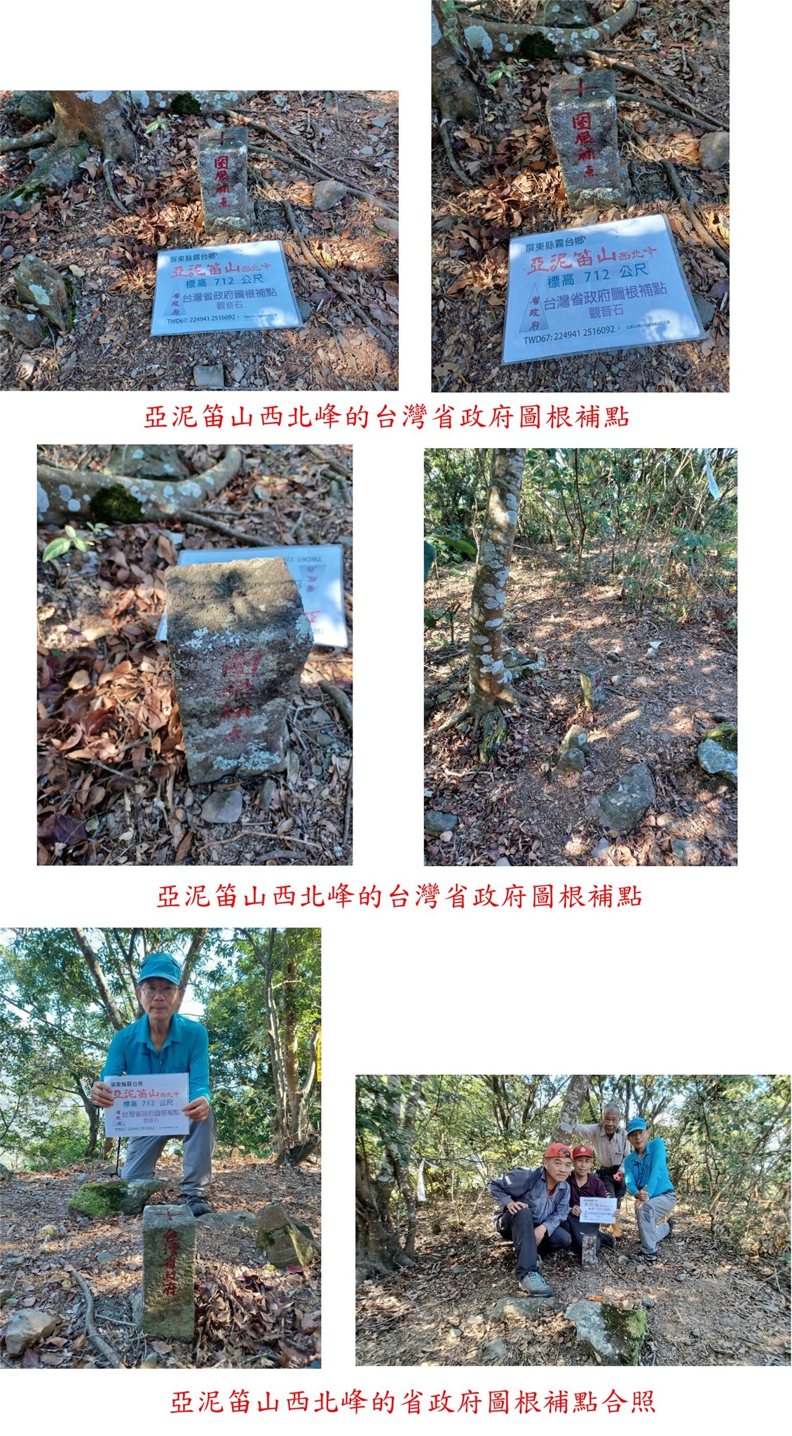 12:02△亞泥笛山西北峰,高710公尺,台灣省政府圖根補點;此點也是阿明教授等山友找到不久來補,上山走1小時56分鐘,山頂展望欠佳,於此間單午餐。