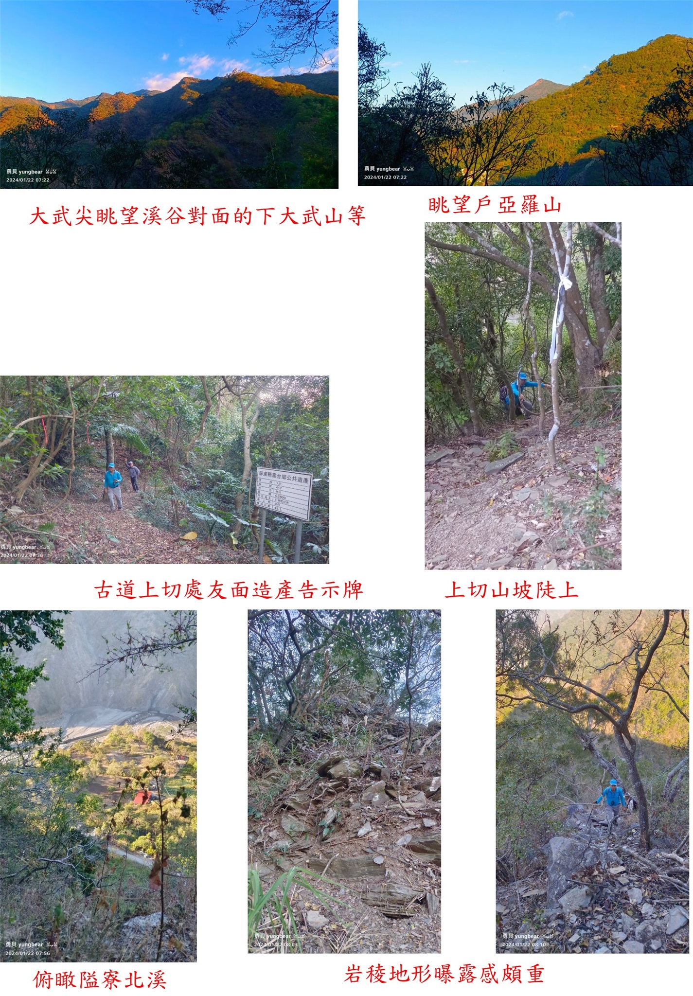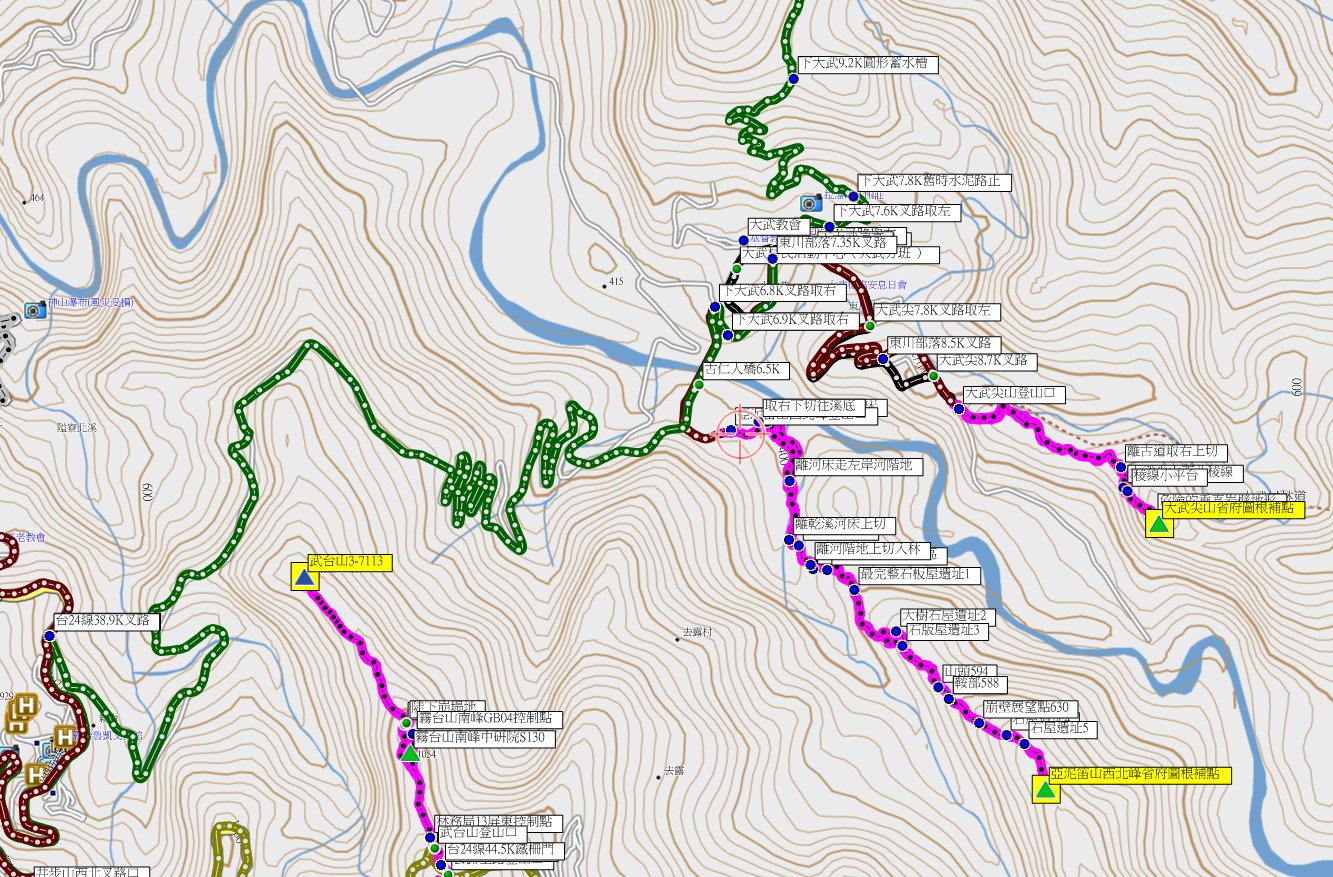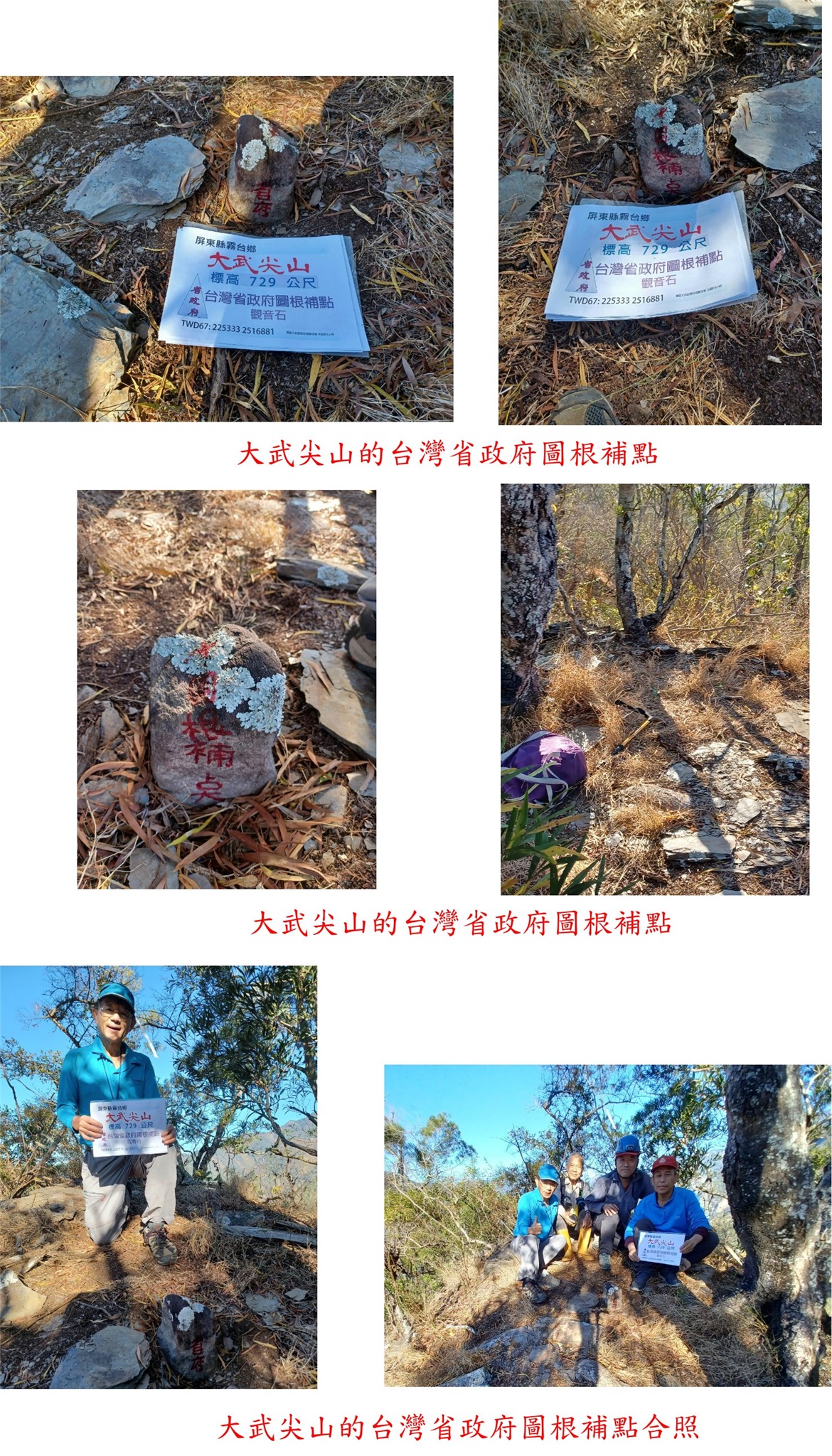 1/20-1/22約山友到南部撿新找到的基石,第3天(1/22)行程先去走阿明教授新找到的2顆基石;第1座的大武尖山的省政府圖根補點,於東川部落附近,前段為路況佳的腰繞古道,右上稜岩稜地形曝露感超重,最後一段為幾近垂直的峭壁地形超危險,走了71分鐘登頂;第2座為亞泥笛山西北峰的省政府圖根補點,登山口於古仁人橋附近,前段要走乾溪底上溯,離河床上切後,稜線平緩地到處是石厝或駁坎遺跡,走了1小時56分鐘登頂;最後遠道來到萬丹,尋訪社皮的東港溪水源保護區界?號水泥柱,號碼被水泥地封住看不到。
