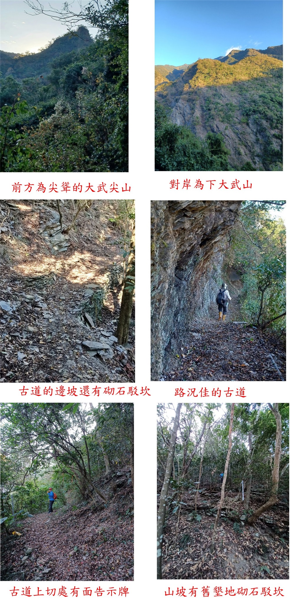 07:18出發,取左舊時通往神趾山的古道行,剛開始有一段階梯路,隨即轉為平緩腰繞小徑,路況超好沿途有水管;古道的邊坡還有砌石駁坎,沿途俯瞰上、下大武與東川等部落,西面眺望德文、戶亞羅與下大武等山,東北面為神趾等山,古道走約6百公尺。