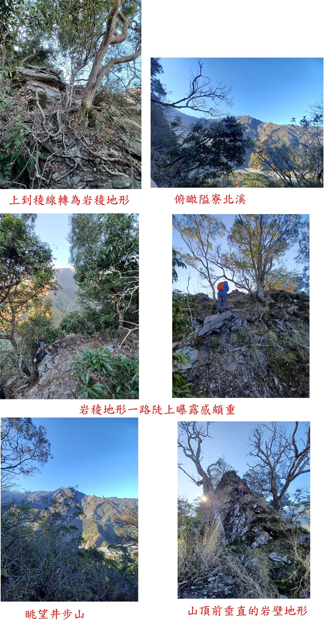 07:46上到稜線,高599公尺,前方隨即有一平台地,岩稜地形曝露感頗重;稜線視野佳,西南面俯瞰隘寮北溪,眺望去露、井步等山,尖聳的霧頭山亦出現在遠方。