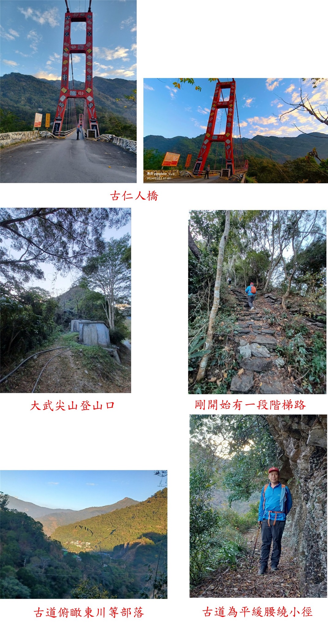 06:13水門市集過三地門橋接台24線(20.9K處),右轉台24線往霧台方向至三德檢查哨登記後續行,台24線走17.8K至神山部落叉路(38.8K處)【0K】;右轉霧台大武聯絡道往大武方向下坡走6.5K 至古仁人橋,此橋僅容一部小車通過;過橋後續行進入大武村6.8K叉路,右轉隨即抵6.9K大武部落叉路,左右線殊途同歸(應取右路線較短);取左線至7.3K叉路,左往下大武山不取,右轉至7.35K東川部落叉路,取左續行至7.8K叉路,左轉部落道路東川部落8.5K叉路;取直或右線殊途同歸,沿途跟隨哈尤溪的指標,取右進入東川部落至8.7K叉路,右轉續走約150公尺。