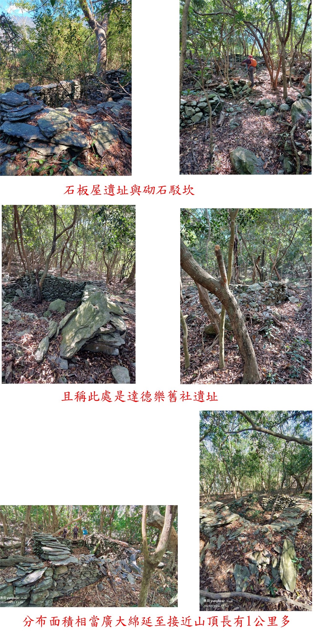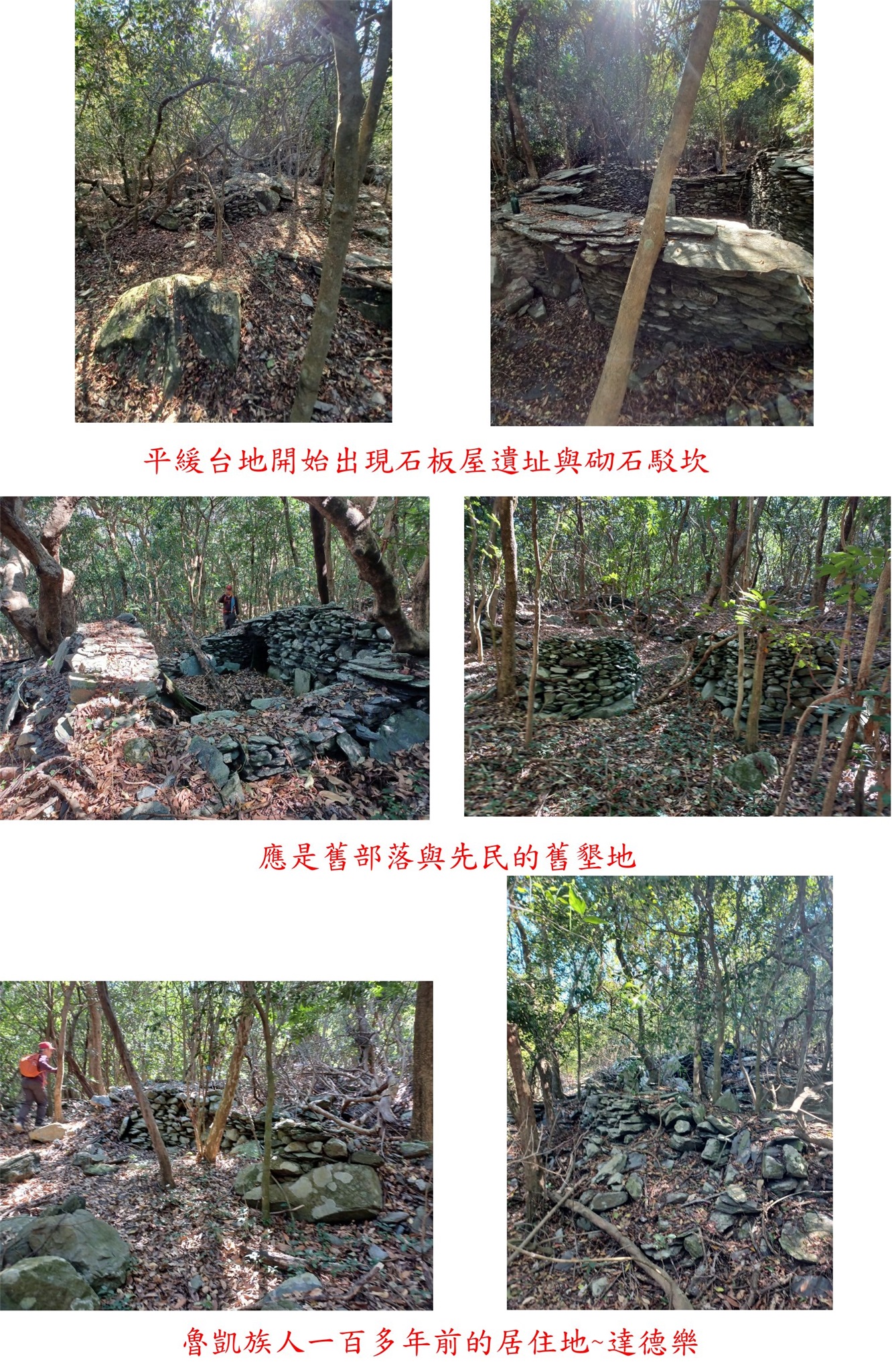 10:45平緩台地,開始出現石板屋遺址與砌石駁坎,應是舊部落與先民的舊墾地;據山友向大武部落族人詢問,此處係大武部落的魯凱族人一百多年前的居住地~達德樂,且稱此處是達德樂舊社遺址,分布面積相當廣大,只要是為平緩處就有石板屋遺址,綿延至接近山頂長有1公里多。