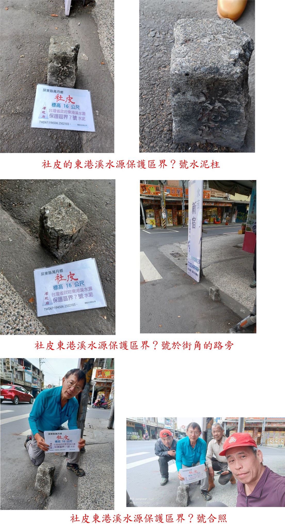 社皮的東港溪水源保護區界?號水泥柱於叉路口,基石於大昌路旁靠近社皮路三段交叉路,基石號碼被柏油路面封住看不到,此點於社皮路三段8號商家的門口,右側有一間「茶之魔手」飲料店;水泥柱有些破損,東港溪水源與台灣省政府可分辨,但設立於何時已看不出?水源保護區界一般都埋在山上,此點於平地相當罕見,此點係謝山友新找到來補。