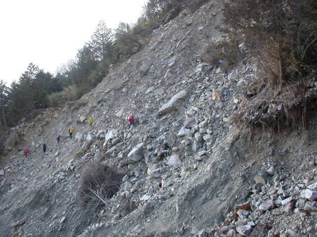 因昨日摸黑趕路,今天得以睡到自然醒。步出室外,雨後萬物皆甦之姿,一切顯得清新!前方山壁有一飛瀑直瀉而下,然波斯鞠卻零落出初綻,未顯風華!今日是沿八通關古道緩坡下降,或許是經歷了風雨磨練,每人臉上雖略見蒼桑,線條卻也多了一份柔和,以愉快心情重返塵世。陳有蘭溪隨恃在側、遠山輕嵐忽攏忽散、而布道時有坍塌需高繞迂迴、乙女瀑布之絹秀、雲龍瀑布之氣勢磅礡、父子斷崖之雄偉….隨著旅程將結束,有太多之戀戀不捨!對山之喜惡,只能道:此情無寄可消除,才下眉頭、卻上心頭!