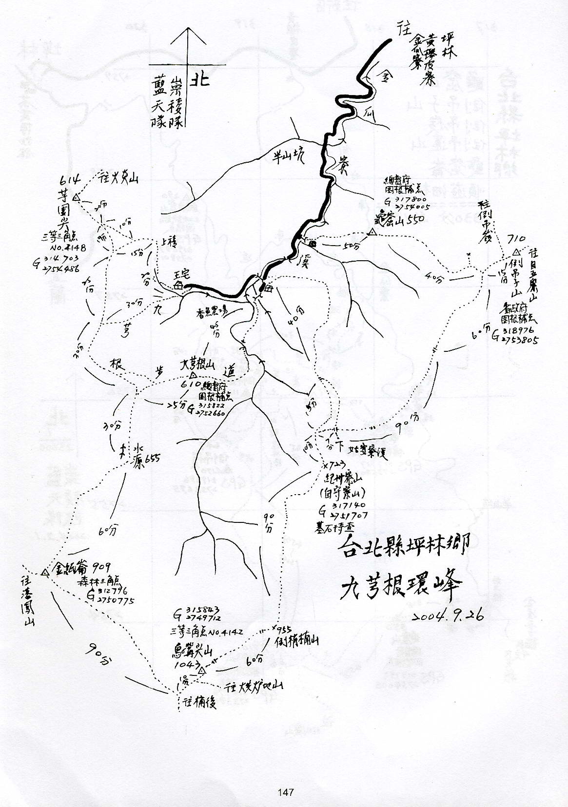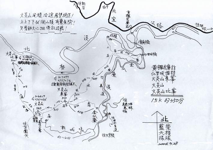 2013.1.9坪林烏窟子山連走黃櫸皮寮山、仁里坂山、火炎山東、主峰下金溪之行,只完成九芎根縱走仁里坂山的一半路程,今續就後段行程,安排由九芎根山連走芋圓尖、火炎山北峰出鐵馬新樂園,整段縱走行程,雖未一氣呵成但也著實為全程路況及時間有些初解,期未來能再完成金瓜寮溪左、右岸稜線縱走