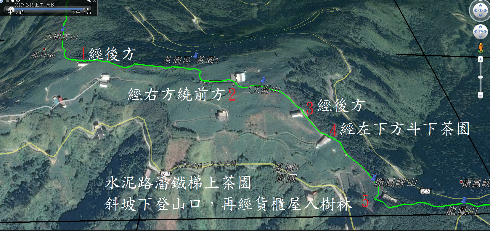 1247運茶車軌道,沿軌道接水泥路取左行,走到往第二茶廠右側續行,經一電表及鐵梯右上,再取左行,要經水塔右側而行。