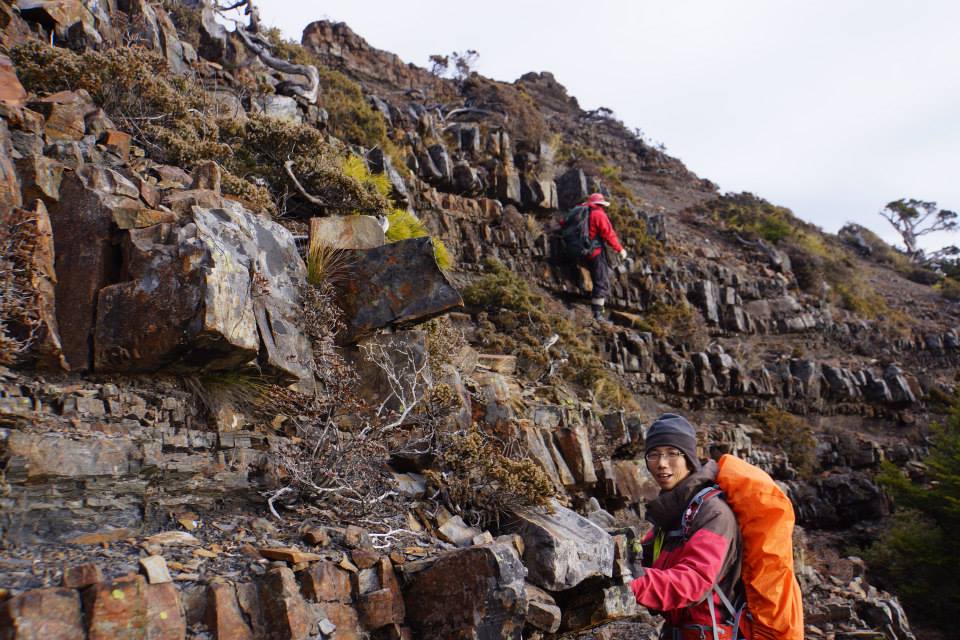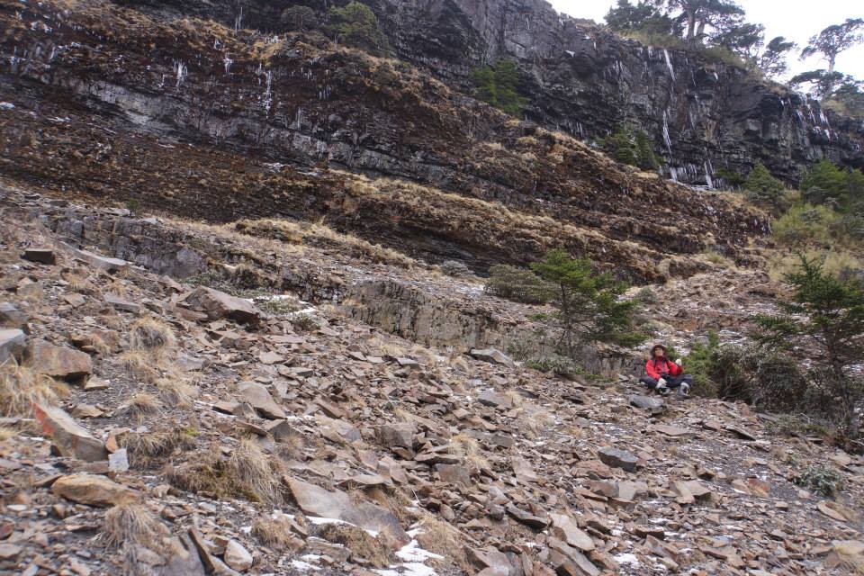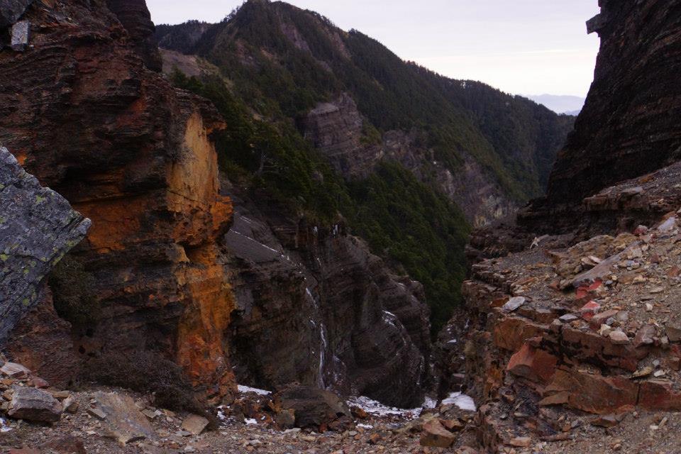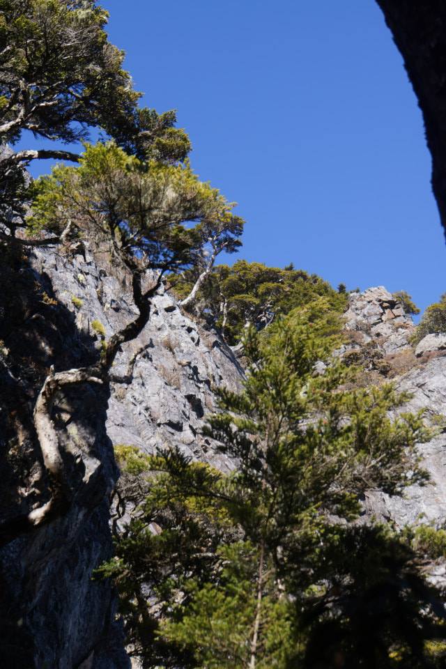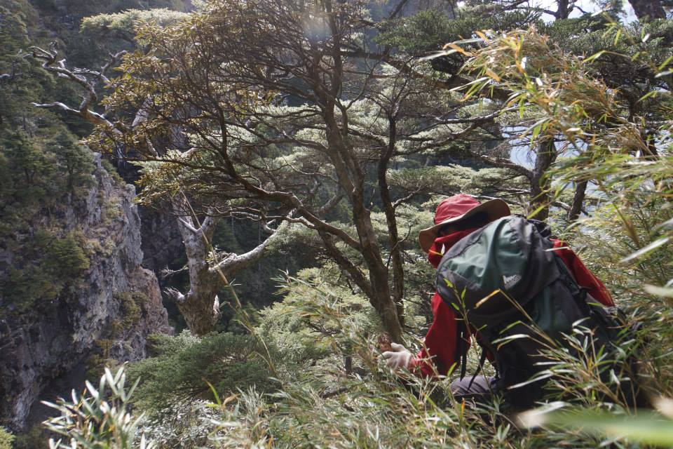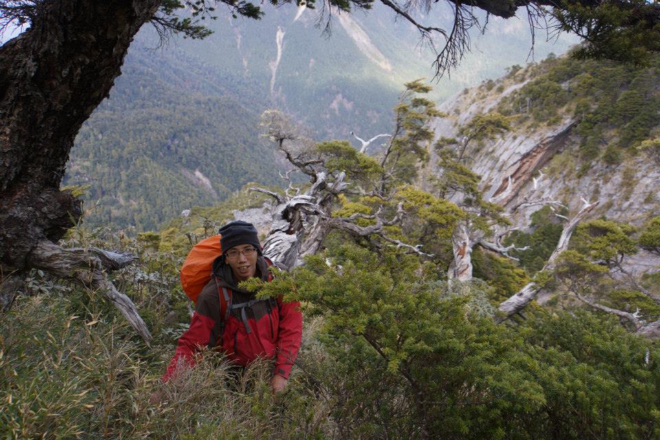 有一個溝可以不用扁帶就可以下到谷線的胺部,接下來由於石頭太松動了,只好向右偏,腰繞到接近第四峰的腳下,再找點爬上去。