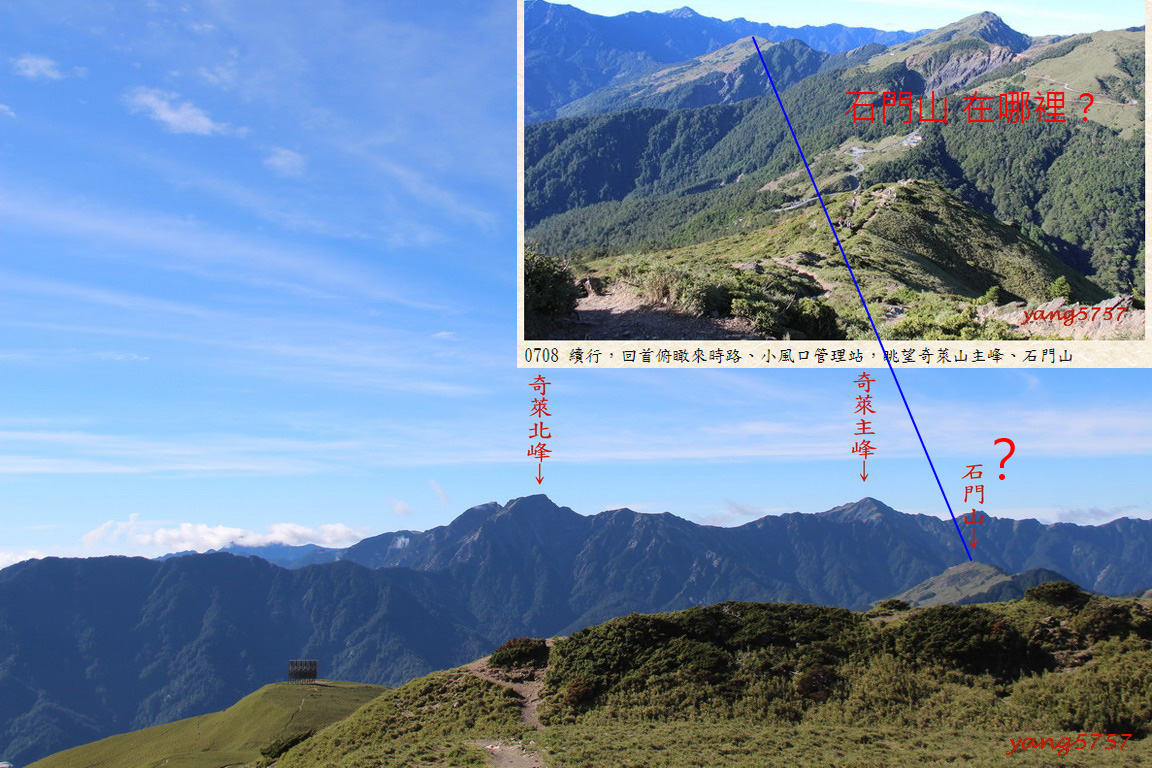 續行,回首俯瞰來時路、小風口管理站,眺望奇萊山主峰、石門山