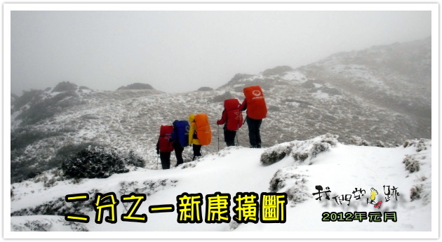 進食補充體能後繼續前進,同樣的強風、同樣的白色,白色的濃霧、白色的大地、白色的風雪、口鼻呼出白色的氣息,天地之間全是白色,看不見目標、看不到路跡或腳印,白色一點也不可愛,而是可怕的。慶幸的是,下的是雪、不是雨,下雨會害我們手腳濕冷、冰凍,下雪只是乾冷不舒服。十三點看到南二段、新康山和嘉明湖的叉路指標,內心萬分興奮,接下去是我們熟悉的「康莊大道」了,家齊提供溫熱的巧克力牛奶分享,全隊再度燃起戰鬥力。
