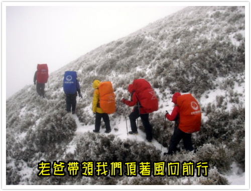 去程短短40分鐘的路程,回程竟然爬了90分鐘。剛開始,對於行走雪地不適應,加上積雪完全掩蓋了路跡,很難辨別步道的位置。濃霧深深影響視線,能見度只有50公尺,一陣強風吹來,前面的人踩下的腳印馬上就消失不見了。抬頭看看領軍的老爸,腰痛和手痛的雙重傷害,表情凝重的找尋航跡,老爸加油,我們愛你!