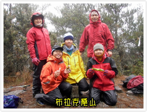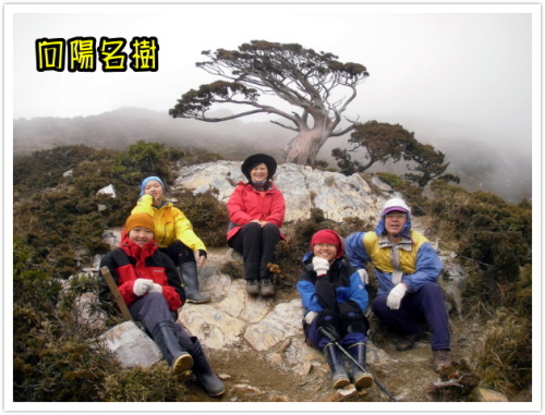 十點到達向陽登山口,家瑋分享溫熱的奶茶,家齊提供暖暖的巧克力牛奶,同樣的熱飲,但是心情不同,喝下肚的感覺也不同。「老爸,我幫你扣雨衣。」、「我替你繫腰帶。」、「不行,拉鍊是我的!」老爸的右手無法施力,我們三個人搶著幫老爸繫腰帶、扣雨衣、拉拉鍊,妏姨看不下去了:「又沒有太陽,曬什麼恩愛嘛!」在同樣的地點拍攝同樣的紀念照,離開登山口,就是面對迎風面的開始,經過三叉山強風的震撼教育,我們不再擔心這段迎風的下坡路段了,老媽和家瑋不約而同的唱起《迎著風、迎著雨》:來吧、朋友,往前去…。