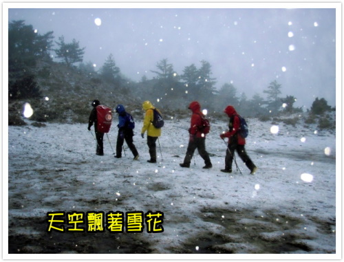 濃霧更加深厚,雨水又轉成了雪花,積雪漸漸增為15公分厚,不只手腳、連身體也開始感到寒凍沒有活力,到底營地還有多遠?雪愈下愈大,掩埋了所有的路跡,箭竹被厚重的雪壓倒在地、阻擋了去路,開始對於白雪感到恐怖和害怕,到底營帳在哪裡?這是第一次覺得回家的路好遠、好渺茫。身體很疲憊、雙腳已經沉重的舉步維艱,然而,我們完全信賴老爸的領導,有信心一定會在天黑前到達營地的,我們一定會拼了老命、靠著意志力走回帳篷的。