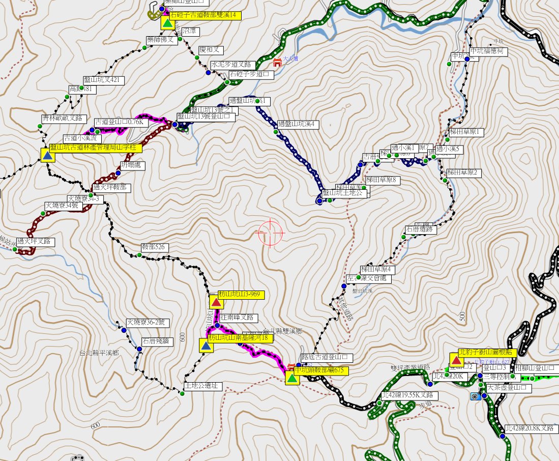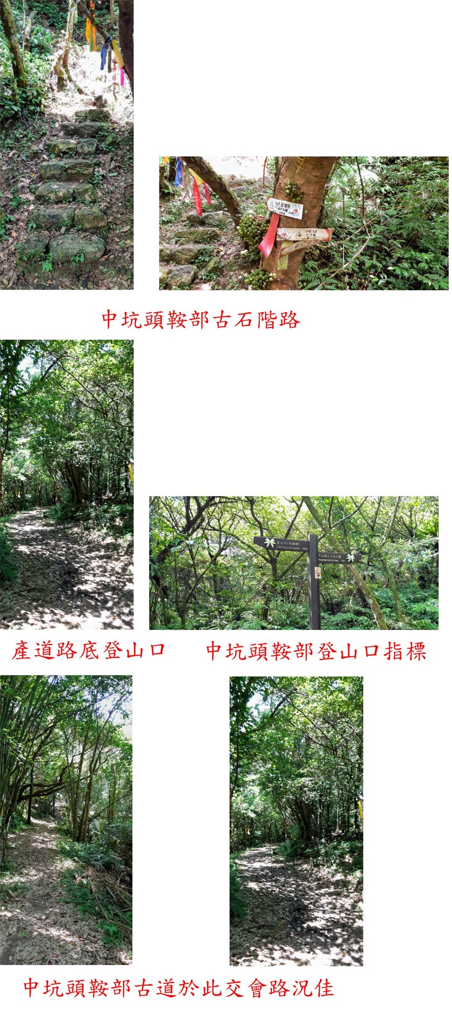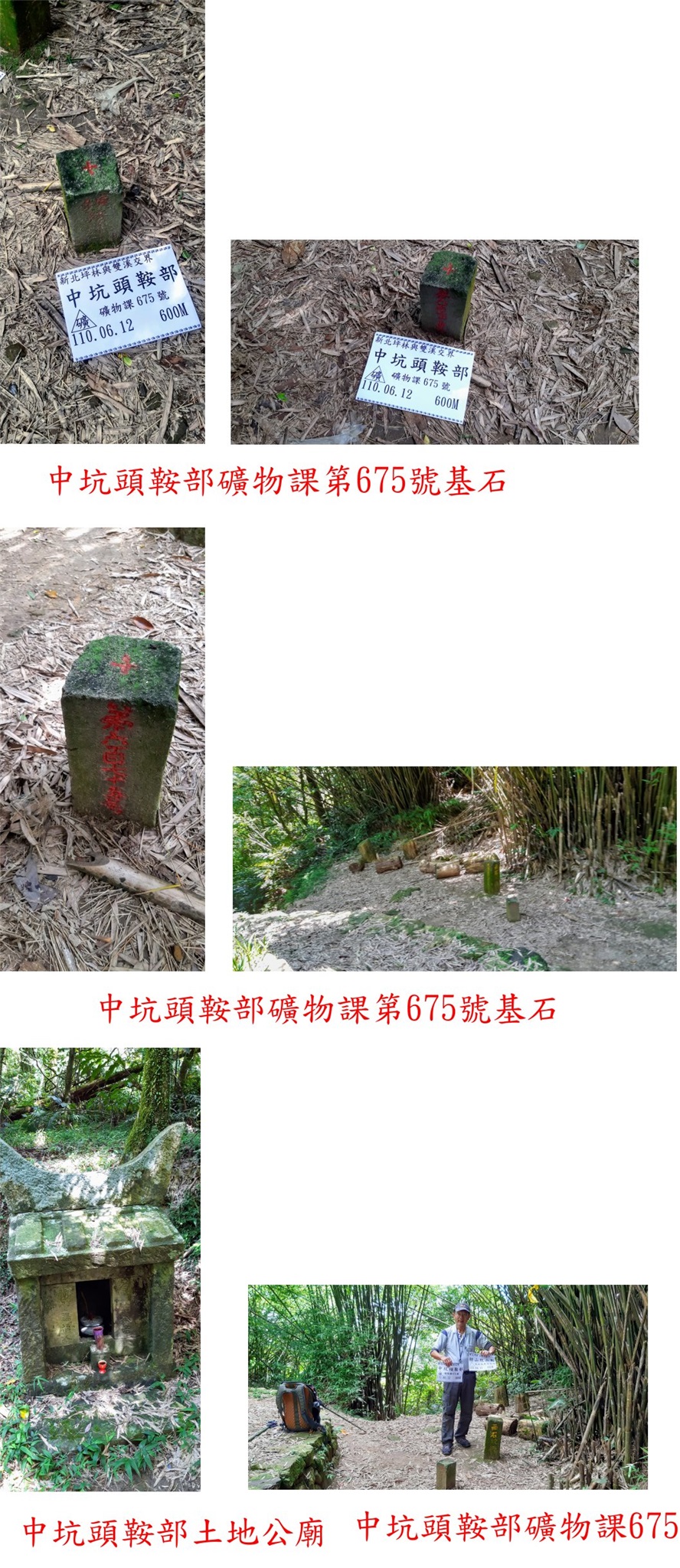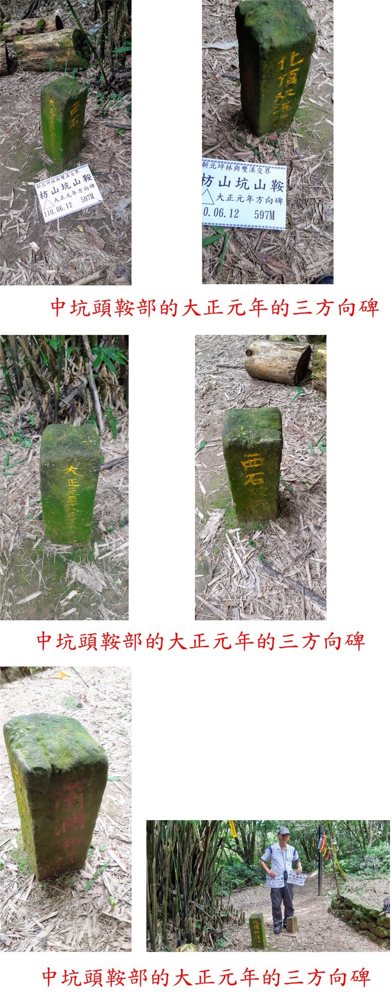 1、中坑頭鞍部:位於新北坪林與雙溪區交界,標高597公尺,礦物課第675號基石與大正元年三方向碑;座標327945 2764294。