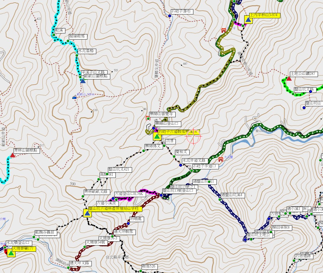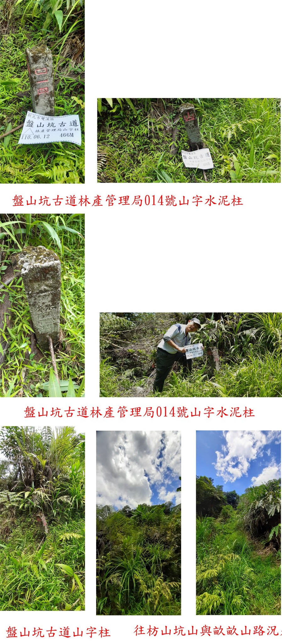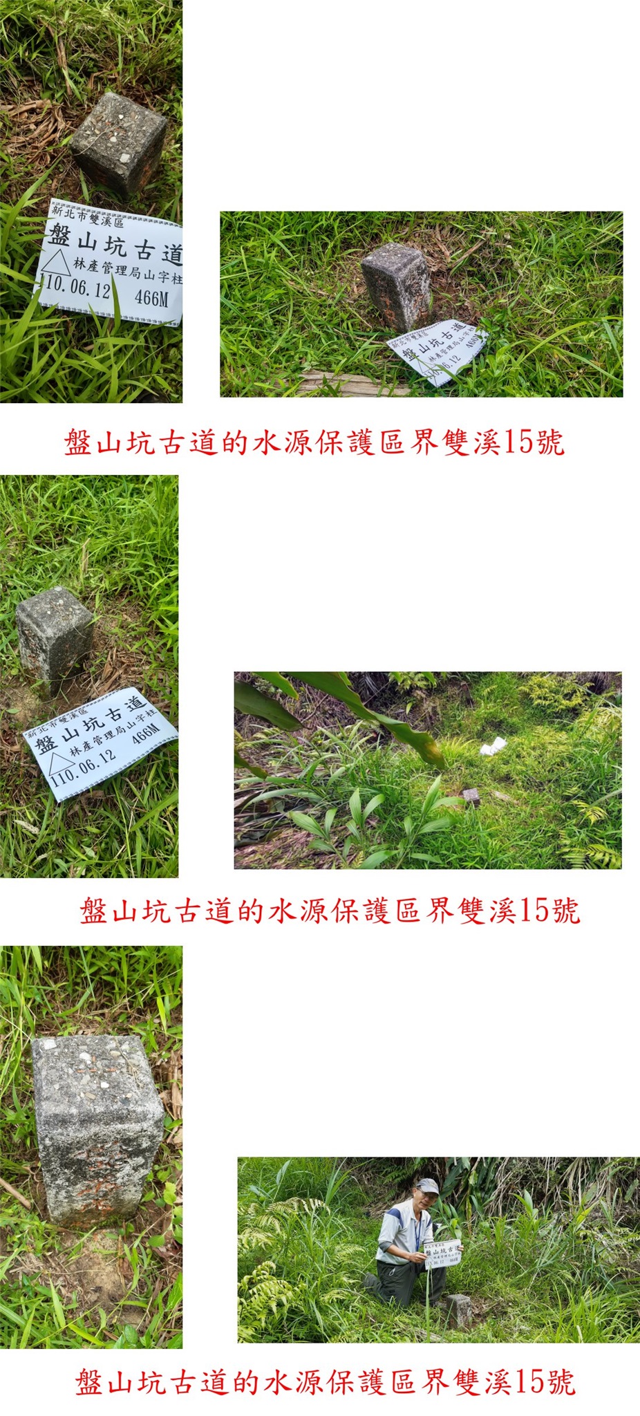 4、盤山坑古道:位於新北市雙溪區,標高466公尺,林產管理局山字水泥柱與水源保護區界雙溪15號等2顆基石;座標326341 2765589。