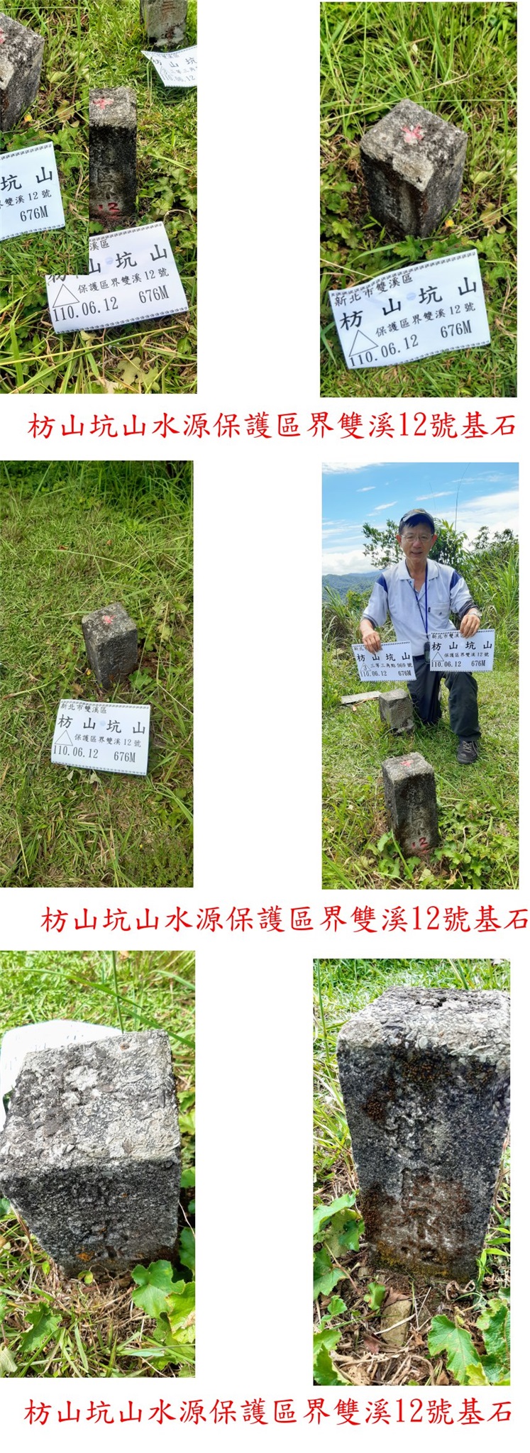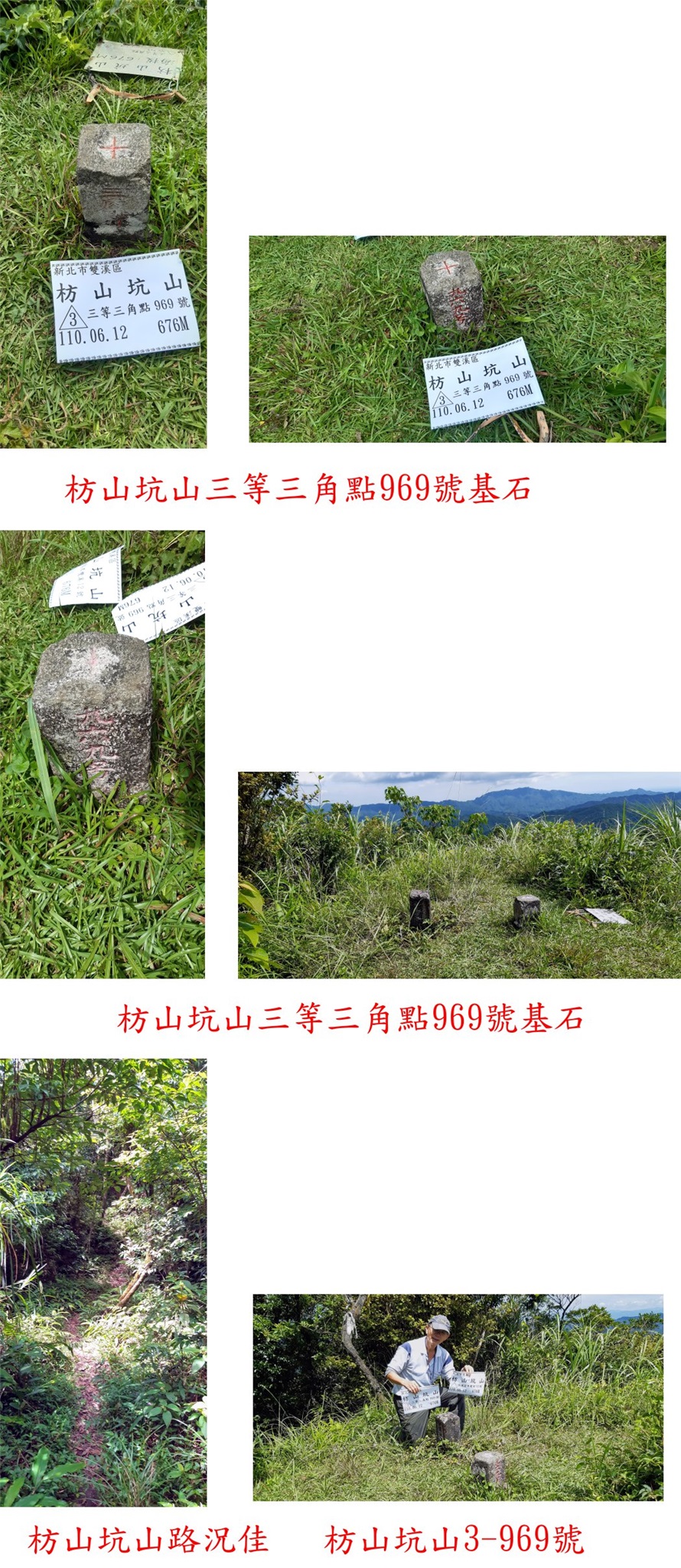 2、枋山坑山:位於新北市雙溪區,標高676公尺,三等三角點969號與水源保護區界雙溪12號等2顆基石;座標3274472764737。