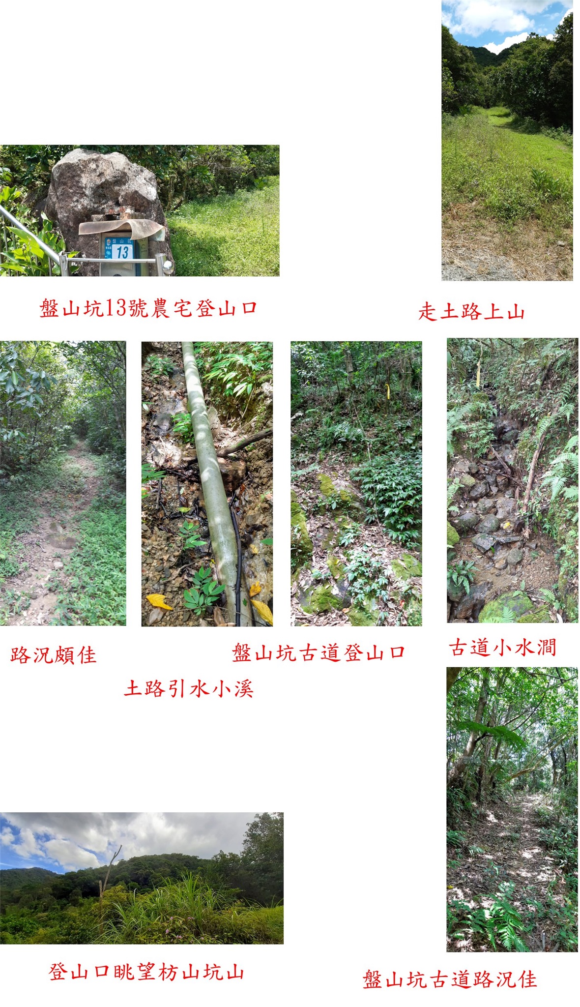 由中坑頭鞍部走北42線原路回走8.2K叉路(27.75K處),左轉盤山坑產道走3.2K停車於盤山坑13號農宅附近,前方即路底,高