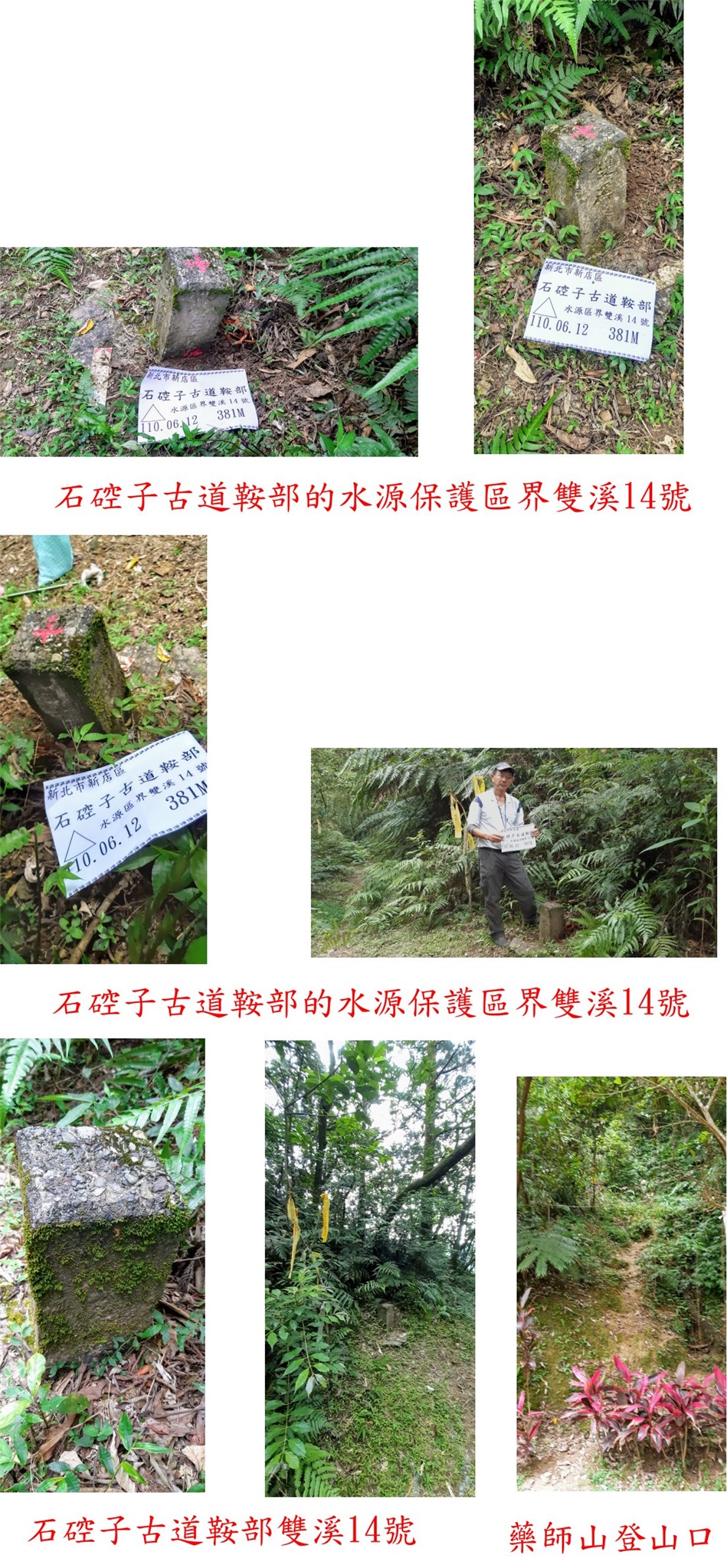 5、石硿子古道鞍部:位於新北市雙溪區,標高381公尺,水源保護區界雙溪14號基石;座標327119 2766373。