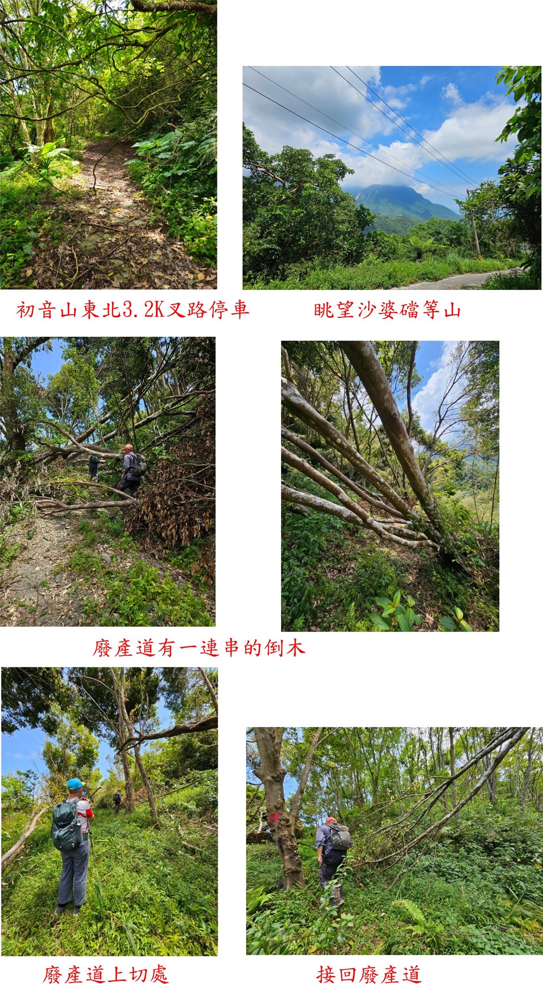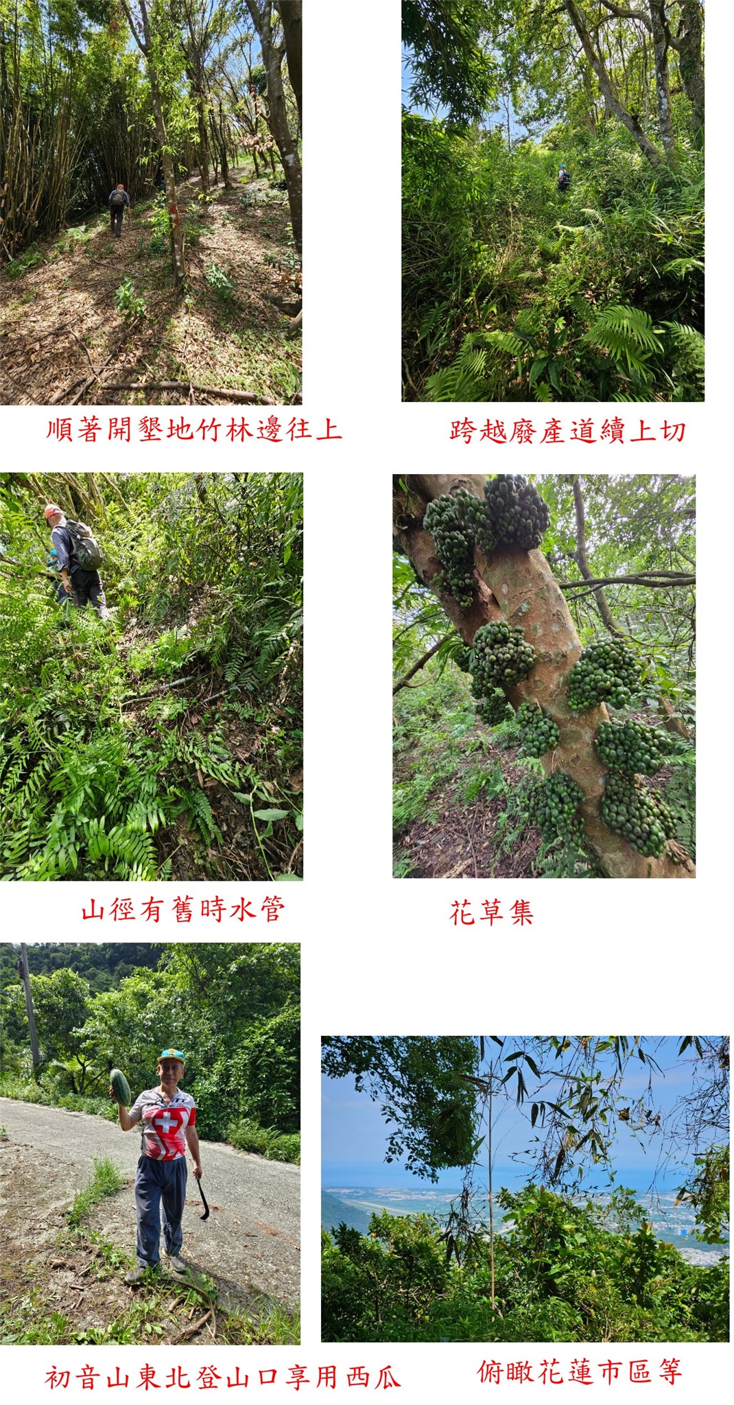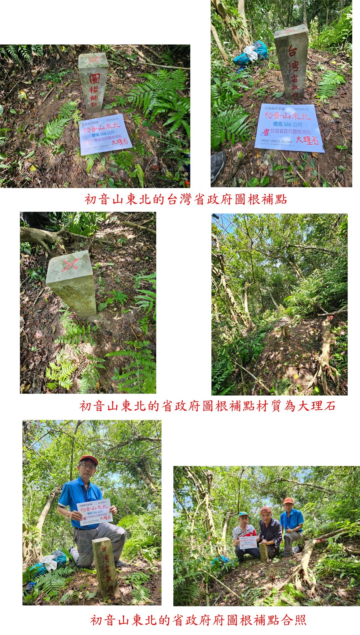 取左廢產道行、隨即有一連串的倒木,因是最近颱風的傑作,此線走190公尺阿倫機車的停車點,續走40餘公尺上切處,有阿倫噴漆;取右廢土路上切進入舊墾地走約90公尺,接到尾稜順著開墾地竹林邊往上走約80公尺接回廢產道,取右廢產道走約30公尺;再度順稜上切走約70公尺跨越廢產道1,續上切走30餘公尺跨越廢產道2,順稜續走90餘公尺,見到初音山東北的省政府府圖根補點;基石材質為少見的大理石,於一平台地無明顯高點、樹林中無展望,此點為台東阿倫新找到的來補,上山走31分鐘;拍照後原路折返,此點累計爬升133m、路程1.4K,往返費時小時13分鐘,於此吃小楊準備的西瓜。