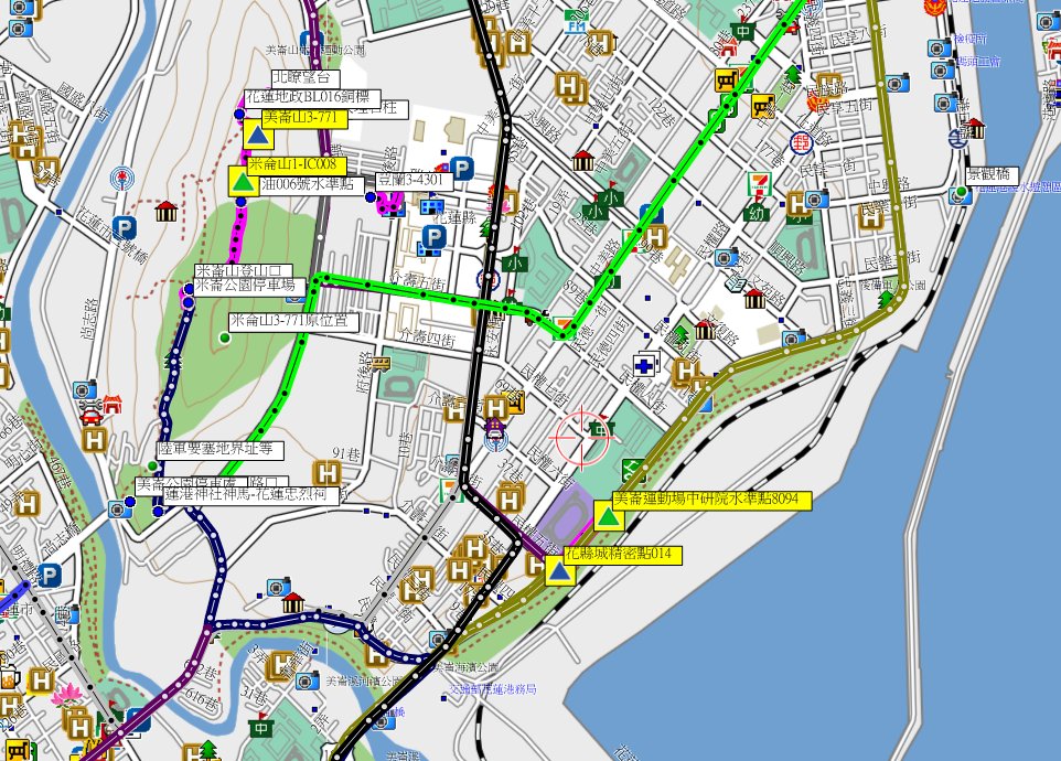 2、美崙運動場:位於花蓮縣花蓮市,標高21公尺,中研院水準點8094號基石;座標312784 2653684。