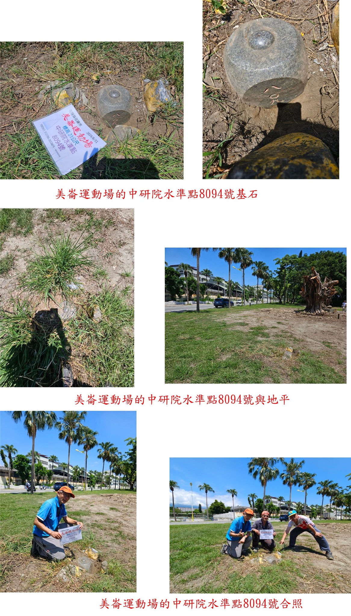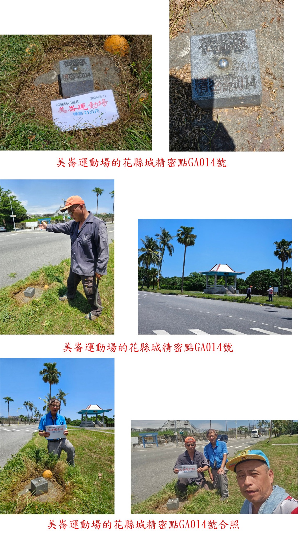 美崙運動場的中研院水準點8094號就在路右公園的草地,基石與地平很不明顯一度還以為公園新移植一棵老樹被挖除;找了一陣子方尋獲,距離路旁約15公尺,於新移植老樹南面約10公尺處,有4顆護石要挖才能拍到號碼,此點山友發現不久來補;於此點南面0.25K(193線15K處),公園靠人行道處,小楊看到1顆花縣城精密點GA014號,意外的收穫。