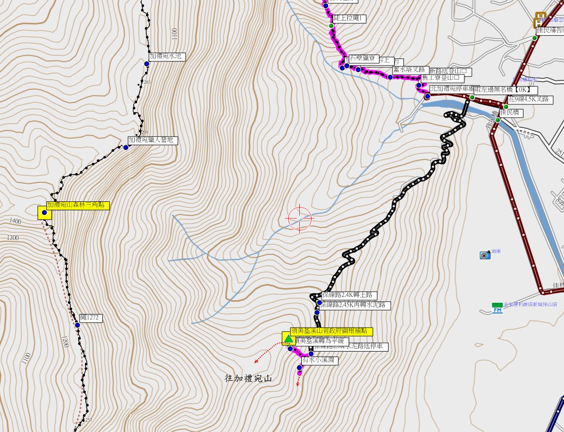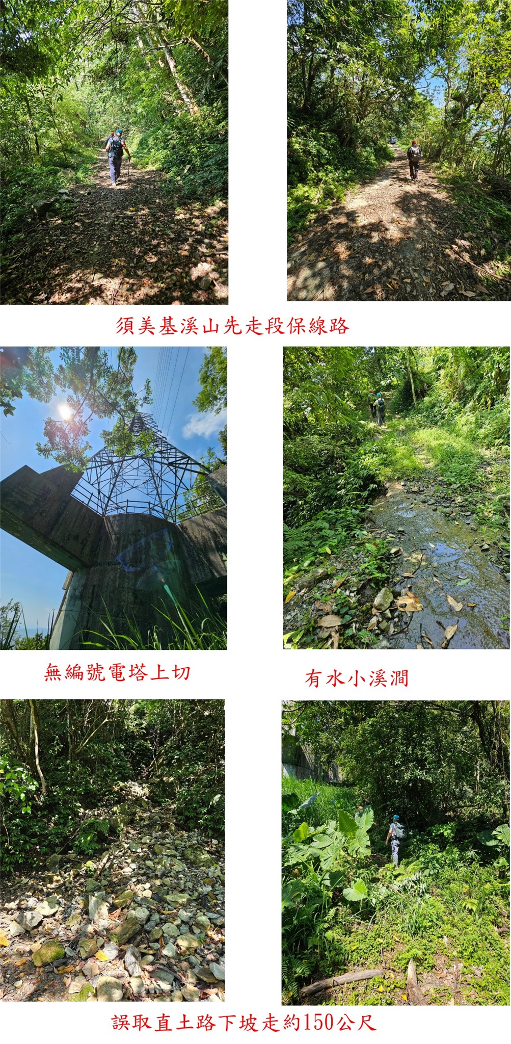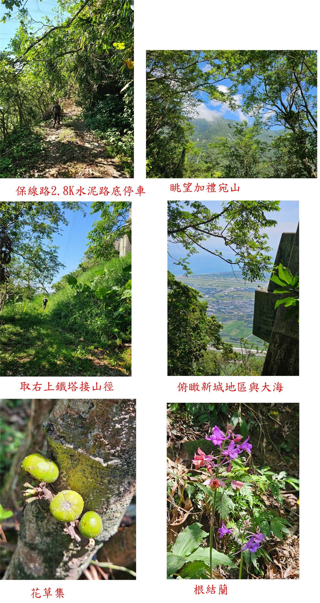 誤取直土路下坡走約150公尺,途中有一有水小溪澗,偏離方向回到水泥路底;取右上到電塔隨即接到往加禮宛山的山徑,電塔處視野佳,可俯瞰新城地區與大海,開始出現稀疏的路條且有阿倫的噴漆,陡上走約160公尺上到稜線平緩地;取右山徑走20公尺,舊山徑往加禮宛山,跟隨噴漆右切走約50公尺,見到須美基溪山的省政府府圖根補點;此點係台東阿倫新找到的來補,基石於支稜的平緩地無明顯山頭,於樹林內無展望,上山含走錯路費時28分鐘(不含走錯路25分鐘);拍照後原路回到停車處,此山累計爬升121m、路程0.94K,往返費時58分鐘(含走錯路),此點比預期簡單許多。