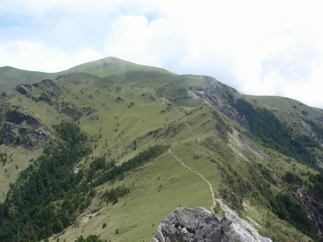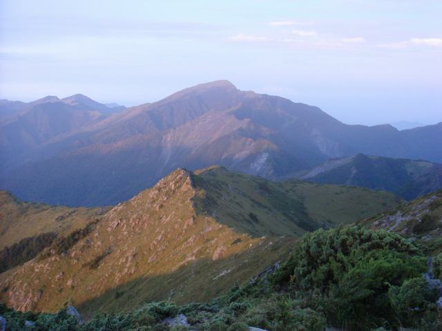 經過一番上坡苦戰,終於上到了稜線,前方映入眼廉是高聳的向陽山,較遠處是三叉山草原,還有更遠處的東台一霸(天宮保壘)--新康山,皆是歷歷在目。
