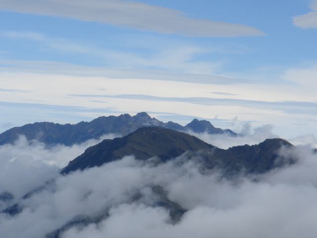 繼續沿著稜線上坡,繞到向陽山背後去後,驚見前方不遠處竟是台灣的屋脊--玉山群峰,一排高聳的山頭漂浮在雲海上,幾乎可以清楚地分辨出每一座山頭的名字,近二個月前才去的玉山,想不到這次感覺又離我們這麼近!!