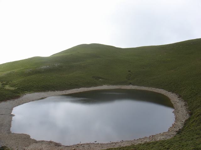 越過平緩的草原山頭,終於,看到一池清澈的湖水,咱們抵達此行的主要目的地--嘉明湖,可惜今天的天空佈滿白雲,所以湖水不是呈現深藍色的,而是映照著四周草原,呈現暗綠色;湖面很大,是我到目前為止看過最大的高山湖泊,根據專家們的推測,這是在台灣發現的「隕石湖」,湖面呈現隕石撞擊後的蛋型,左上方的草原處還有水流被截斷的痕跡;嘉明湖四周是大草原,所以常有水鹿群到此地飲水,讓人不禁打從心裡好好愛惜這個上帝賜給台灣的人間仙境。