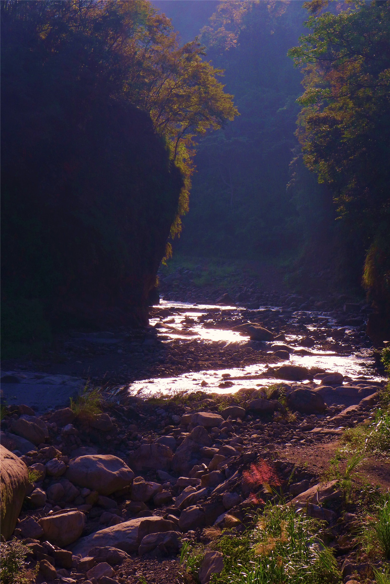 紅橋之下,便是石門。石門狹仄,粼粼見水光。便去履,涉其流。溪水寒,峽谷幽。復行百來步,豁然開朗。溪谷廣闊,礫石雜然。有芙蓉芒芥灌叢之屬。溪流蜿蜒,流水淙淙。其中猿啼鳥鳴,山羌嗚叫,悉如天籟。走獸飛禽,並怡然自樂。