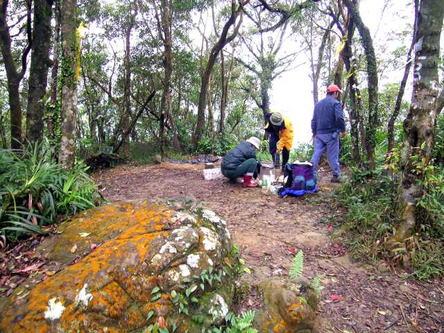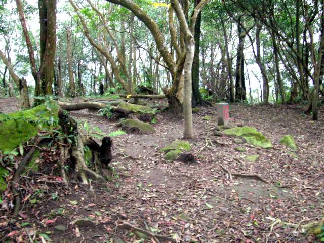 12:52-11:00 [21炙子頭山],土地調查局圖根點,叉路口,藍天隊指路牌:右往昇高土產道30分、烏月山100分。山頭寬闊但四周樹木林立無展望,趕上來的三位山友在此煮麵,小休。H527M(GPS529M)