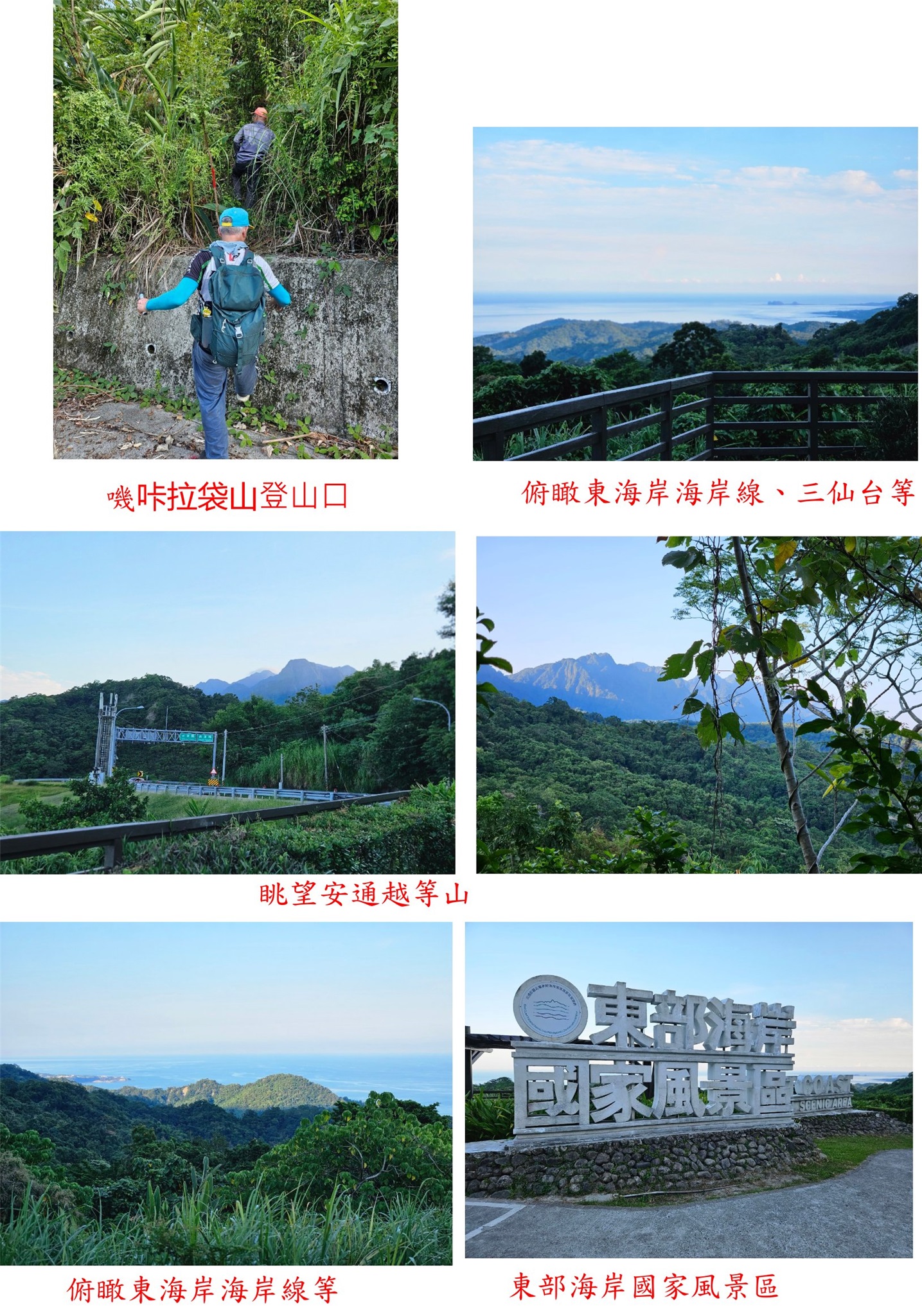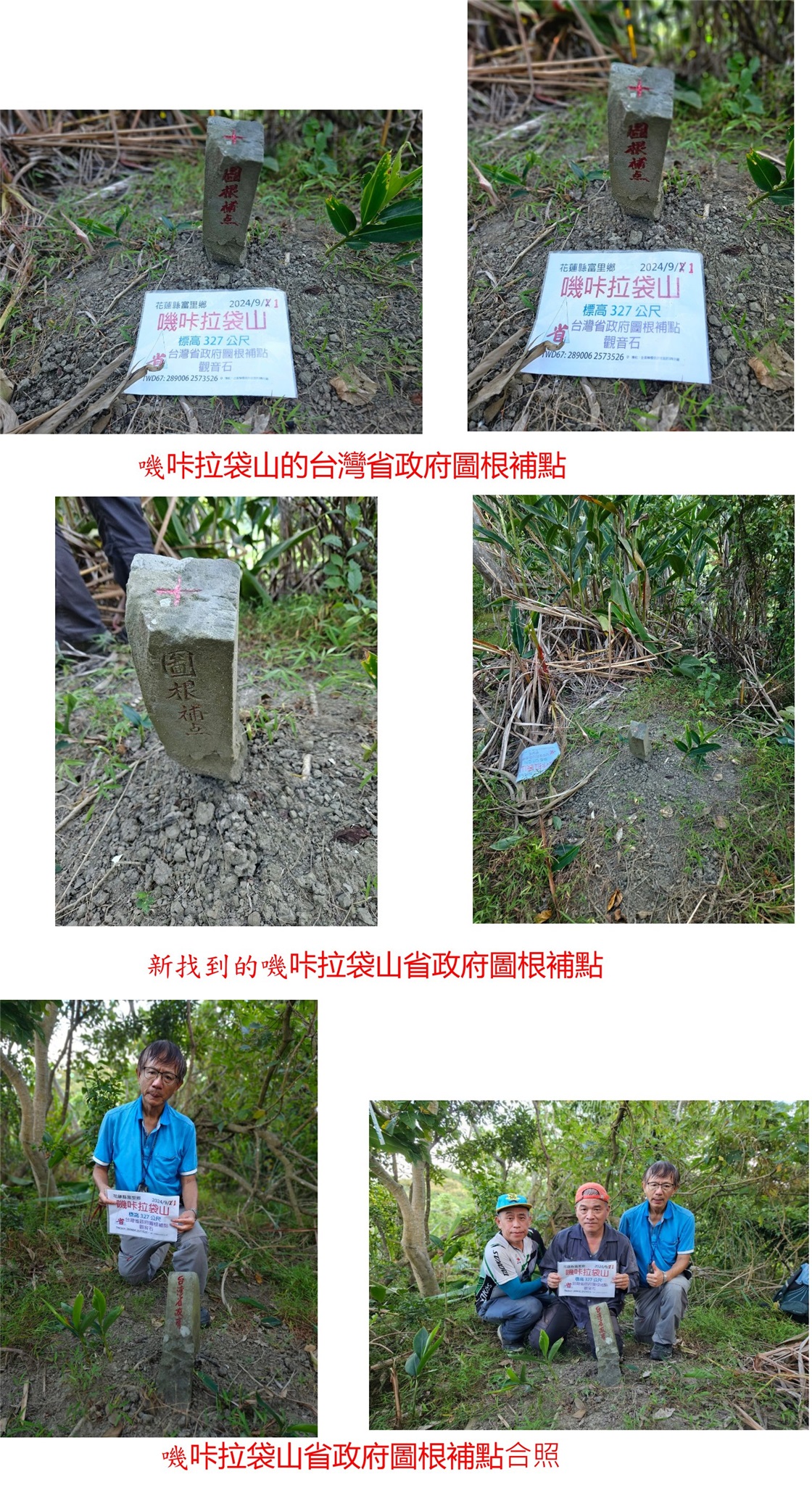 取右上到駁坎上方,隨即見到嘰咔拉袋山的省政府圖根補點,上來只要2分鐘;基石於平台地非高點,係台東阿倫新找到的來補,此點往返費時11分鐘即輕易達陣。回到玉長隧道的觀景台賞景,俯瞰東海岸海岸線、三仙台等,車行回到玉里市區夜宿。