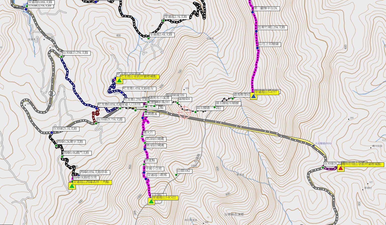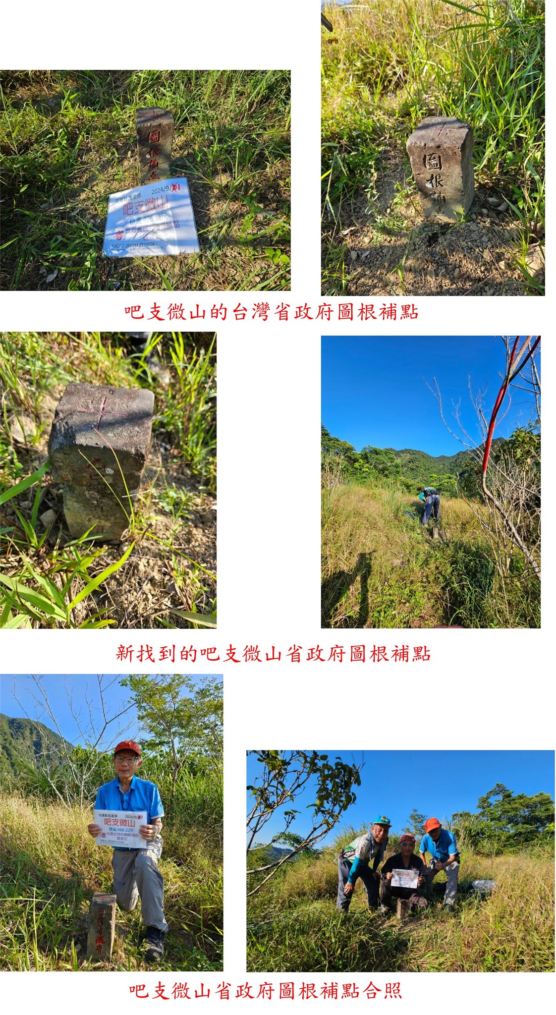 3、吧支微山:位於花蓮縣富里鄉,標高496公尺,台灣省政府圖根補點;座標286028 2574565。