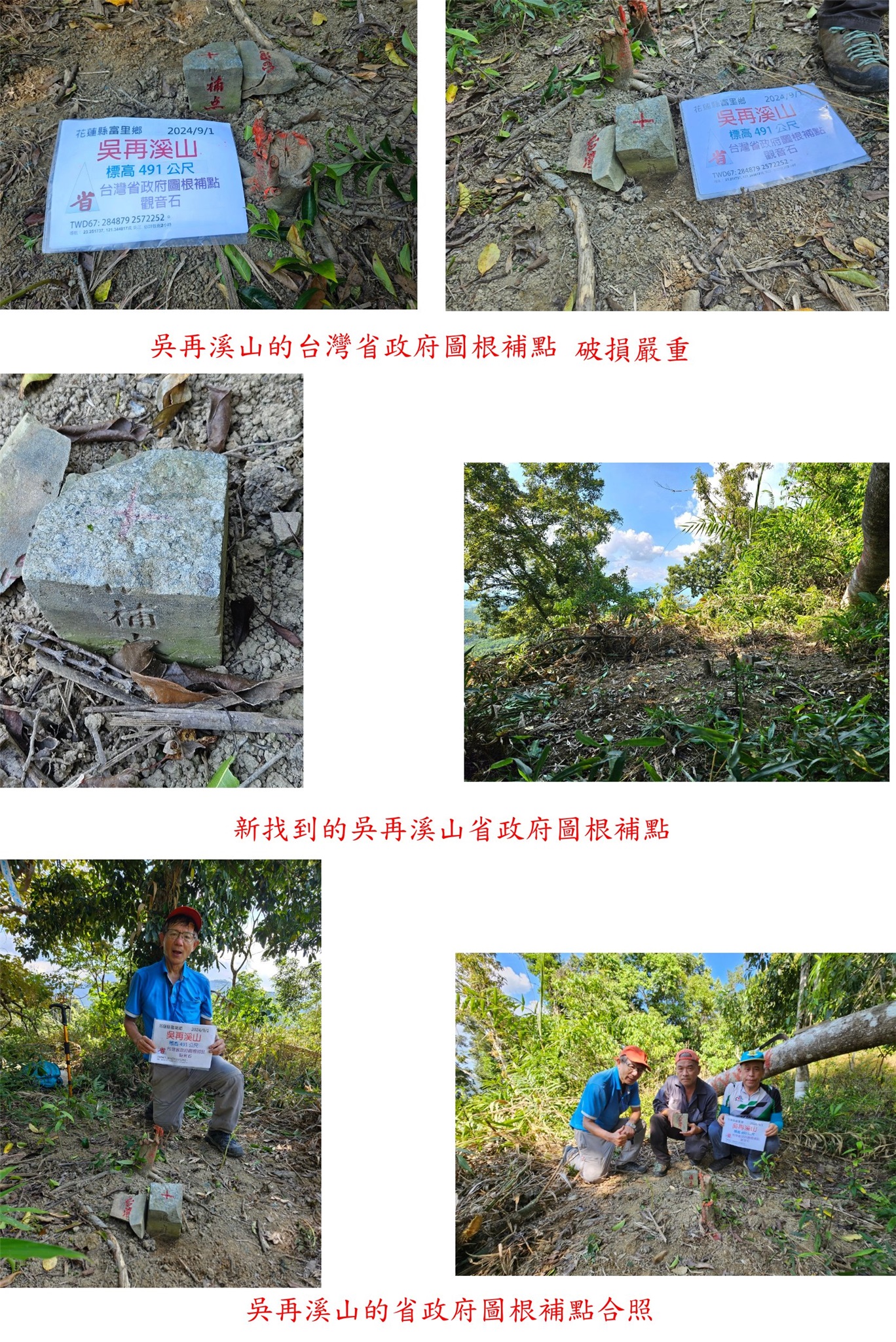 2、吳再溪山:位於花蓮縣富里鄉,標高491公尺,台灣省政府府圖根補點;座標284868 2572260。