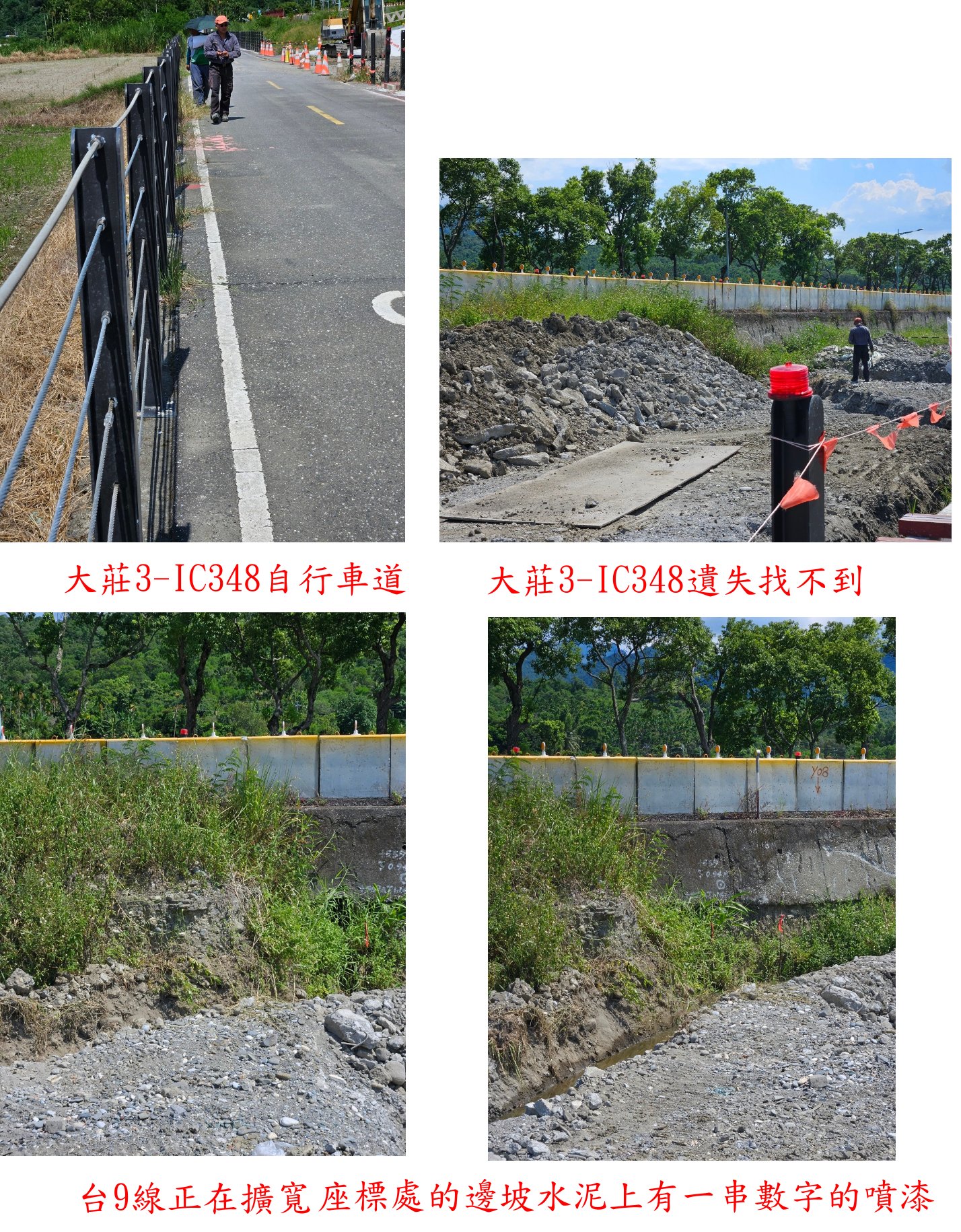 此點就在路左(道路的東面),此段台9線正在擴寬,路左有一自行車道,四處找不到大莊3-IC348內補基石;座標所在的台9線邊坡水泥上有一串數字的噴漆,不知是否與補點有關?大莊3-IC348應已遺失,附近另有1顆大莊山3-IC187則尚在。