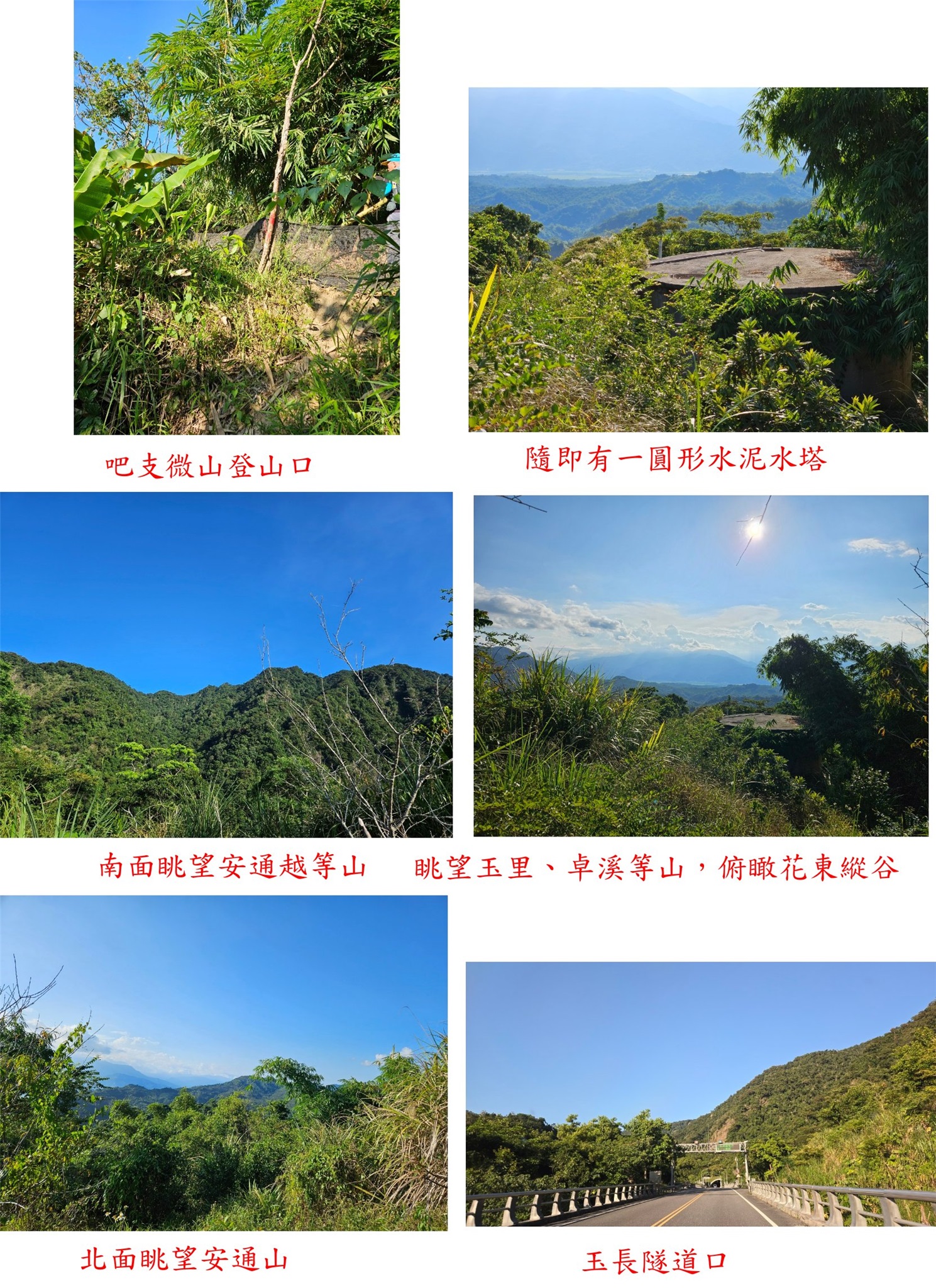 取右跨過圍網進入開墾地,隨即有一圓形水泥水塔,前方找到吧支微山的省政府圖根補點,上山只要3分鐘;此點係平緩的小山頭,展望還不錯,南面眺望安通越山,西北面眺望玉里、卓溪等山,俯瞰花東縱谷;拍照後緣路折返,此點往返費時15分鐘即輕鬆入袋。