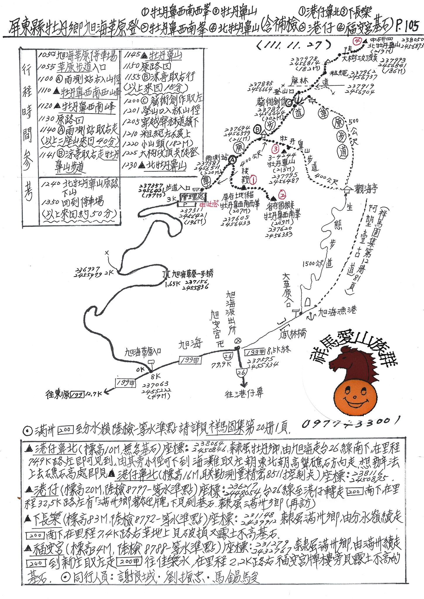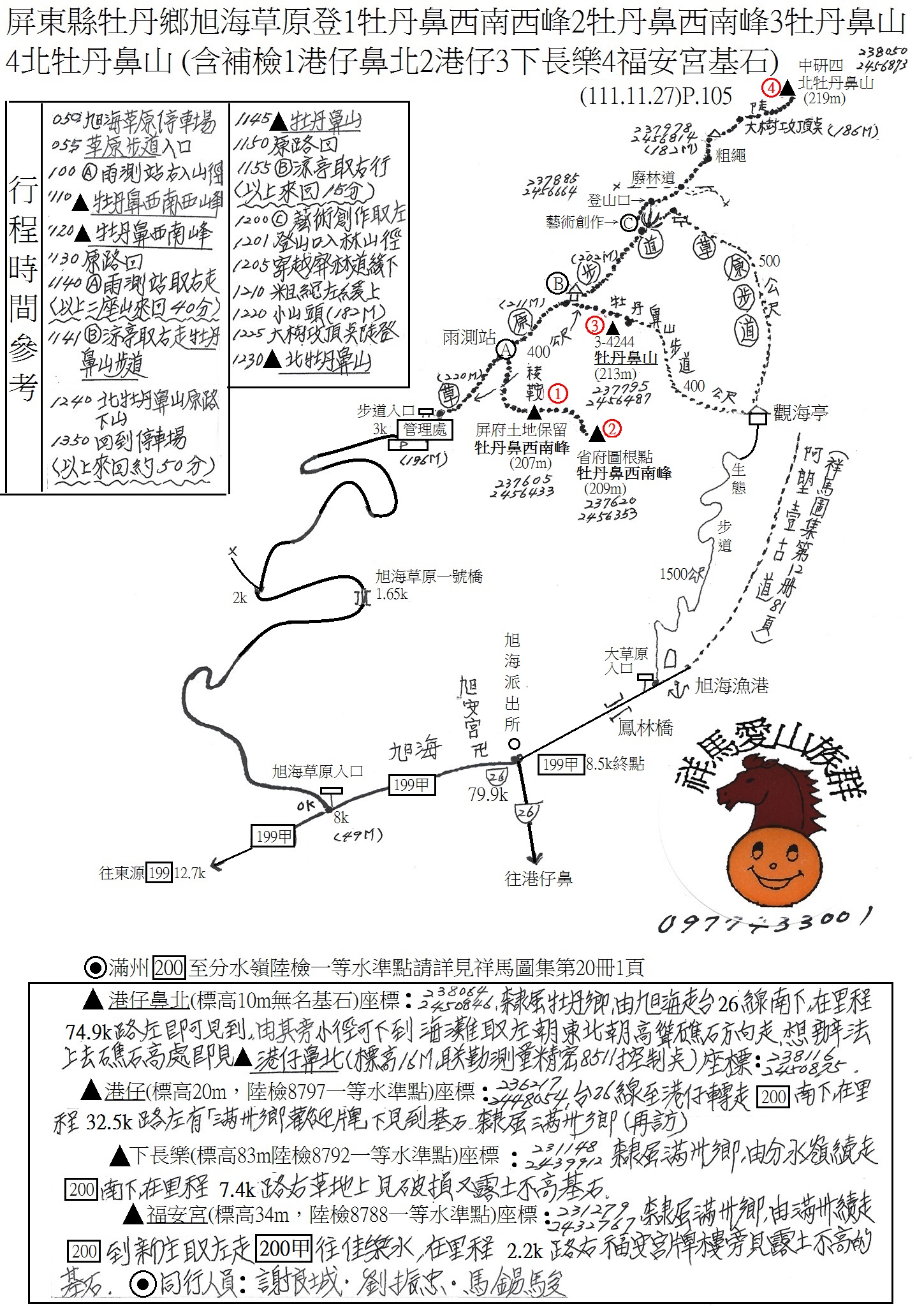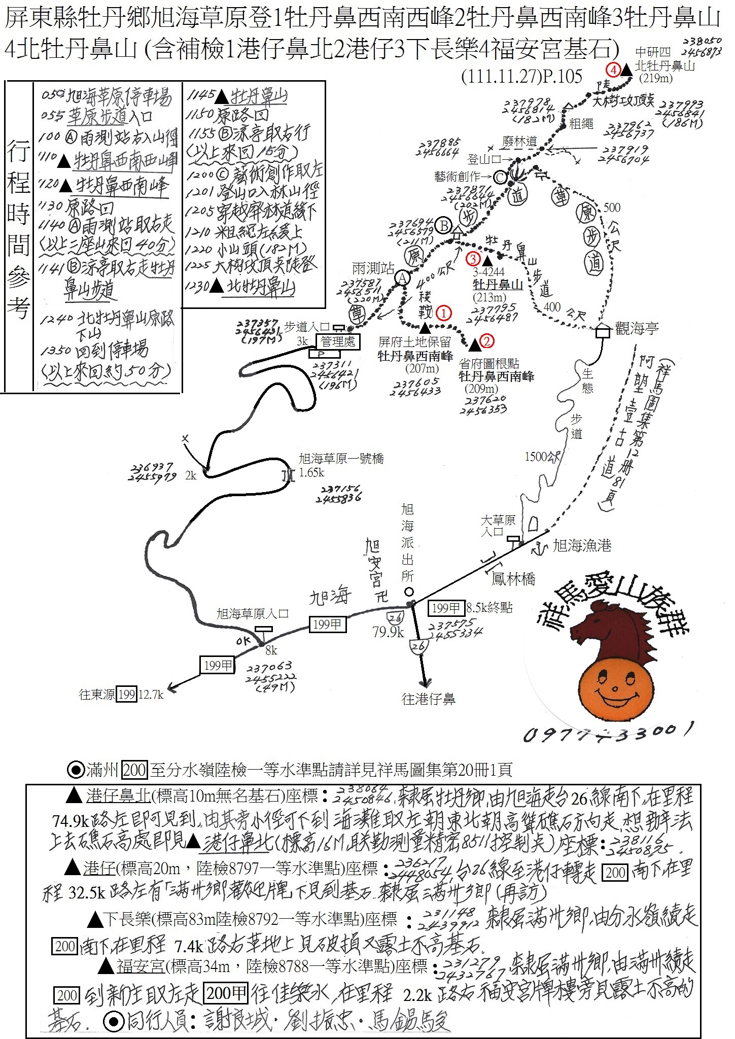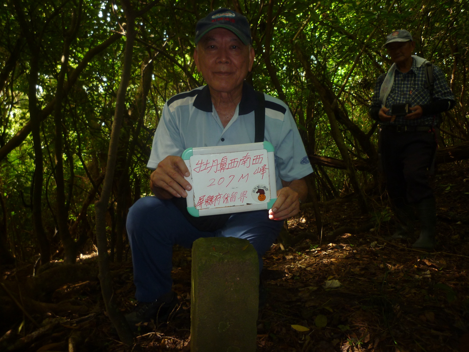 5牡丹鼻西南西峰(標高207M,屏東縣政府土地保留界石),座標:237605.2456433,基石很碩大,立於稜鞍處