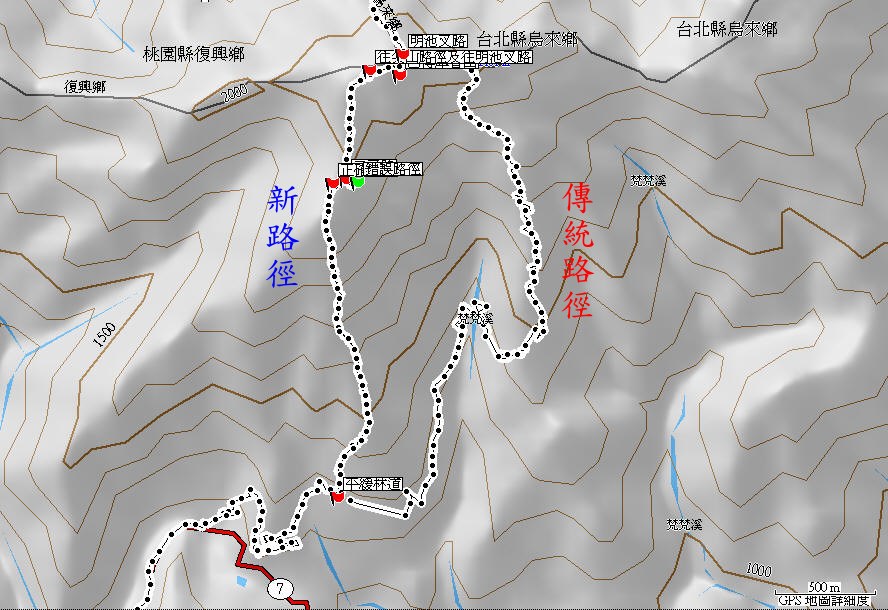 之路徑1.往玫瑰西魔山路徑及2.往復興尖山路徑 及3.先走復興尖山路徑到達